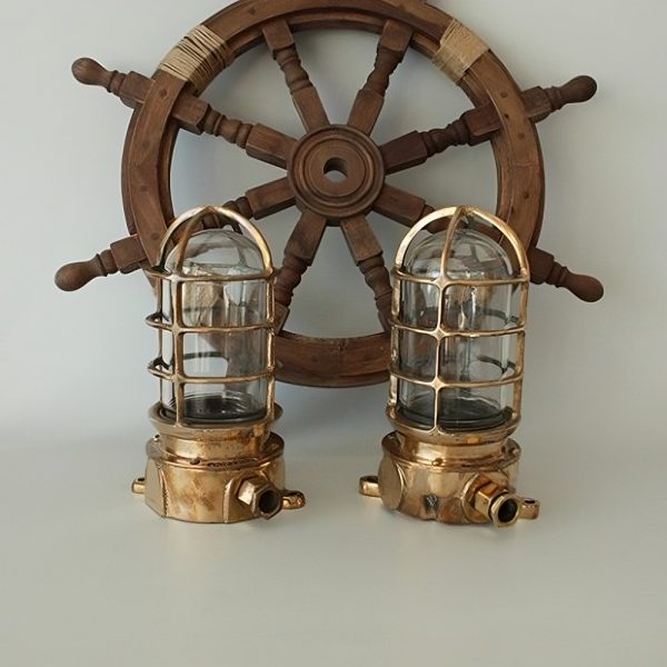 Authentic Pauluhn brass bulkhead wall lights with clear glass domes and protective cages, rewired with UL-listed parts for nautical and industrial interiors.