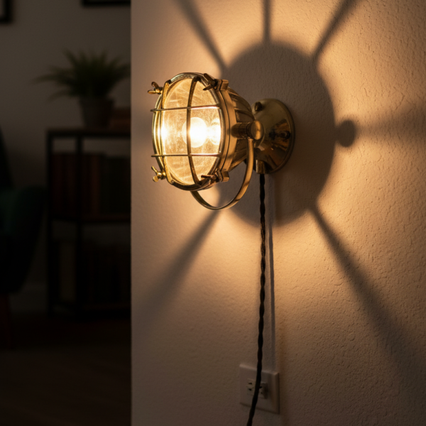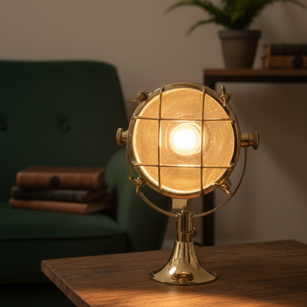 Vintage Adjustable Brass Nautical Spotlight – Marine Table or Wall Lamp | Industrial Ship Searchlight Reproduction