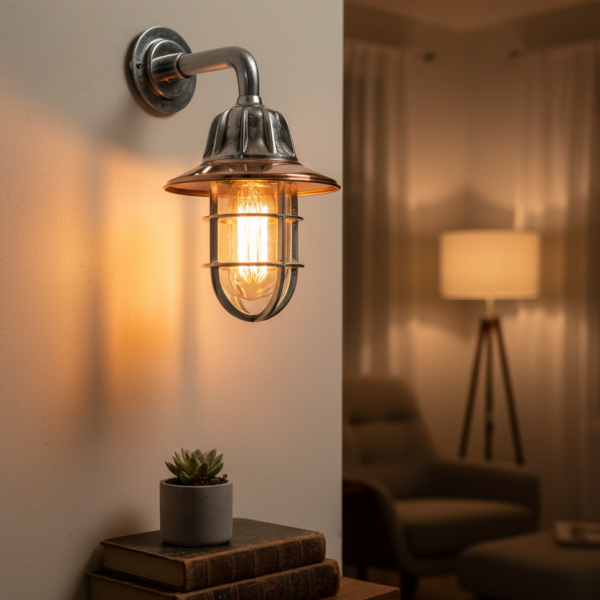 Aluminum Nautical Wall Sconce with Copper Shade | Marine Bulkhead Cage Light Fixture | 13-Inch Industrial Coastal Wall Lamp for Indoor & Outdoor Decor