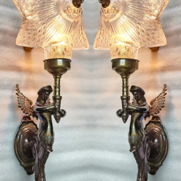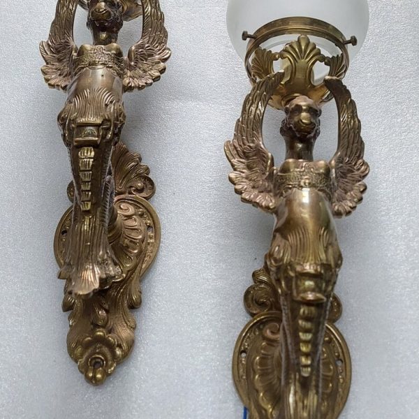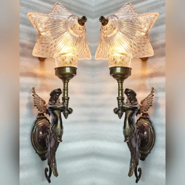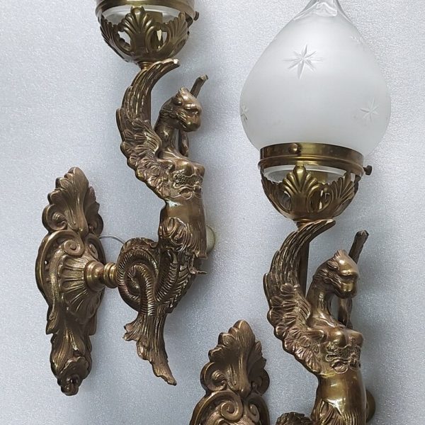 Pair of Vintage Art Nouveau Brass Wall Sconces | Lion & Mermaid Design Antique Wall Lamps | Star Glass Shade Light Fixture