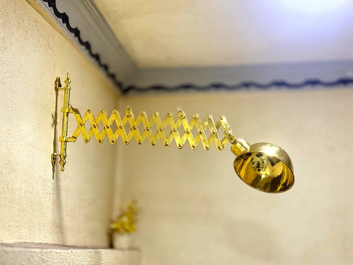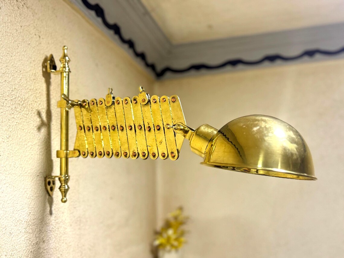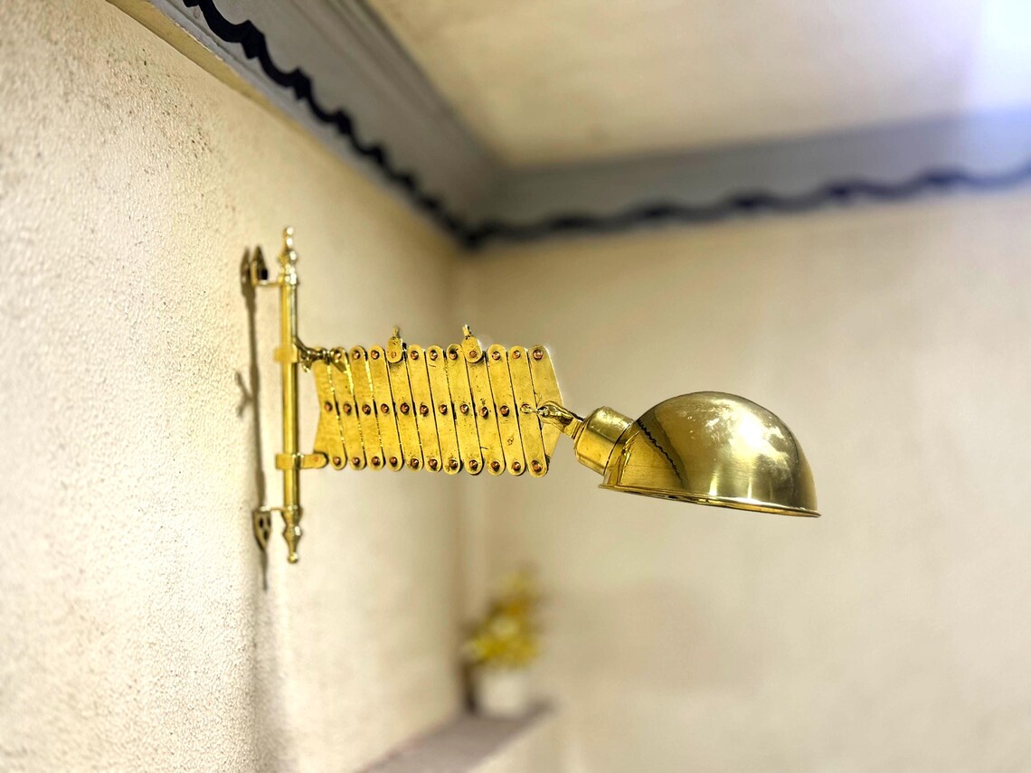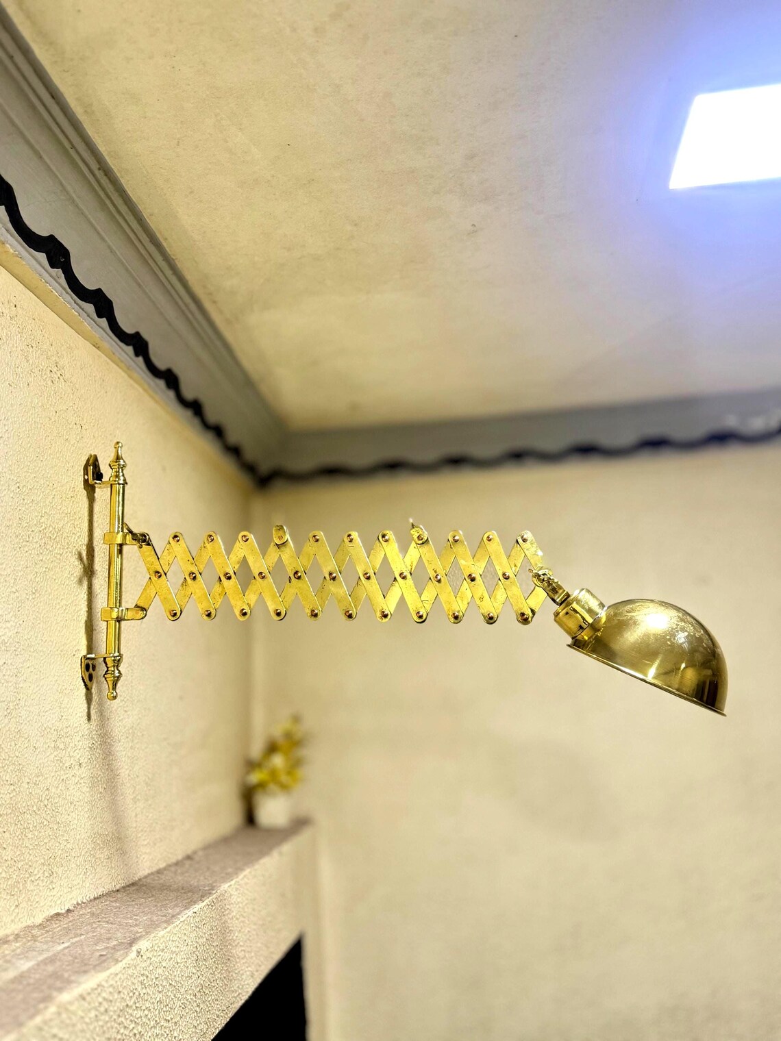 This Antique Brass Swing Arm Wall Lamp is a striking example of vintage industrial lighting, inspired by early 20th-century factory, library, and ship cabin lamps. Crafted from solid brass, this wall-mounted light features a classic accordion-style scissor arm with a smooth adjustable swing mechanism, allowing the lamp to extend, retract, and pivot effortlessly.