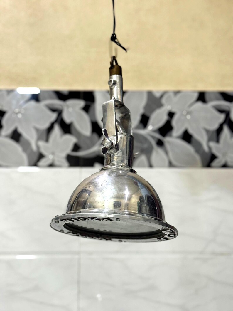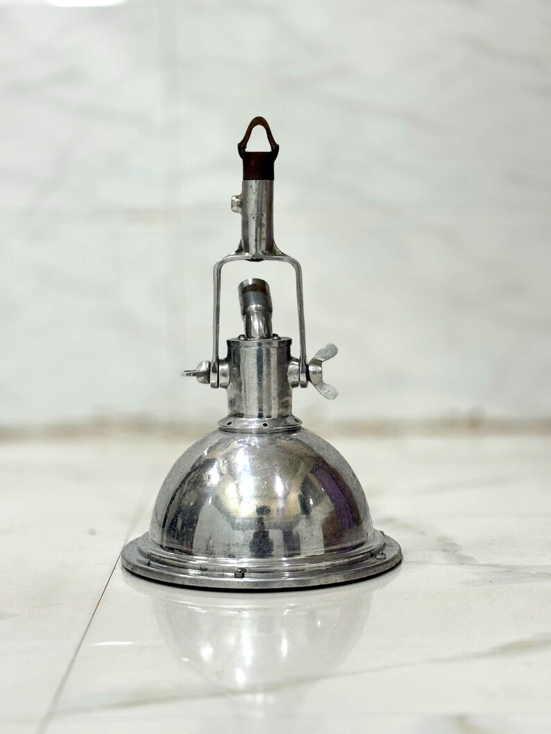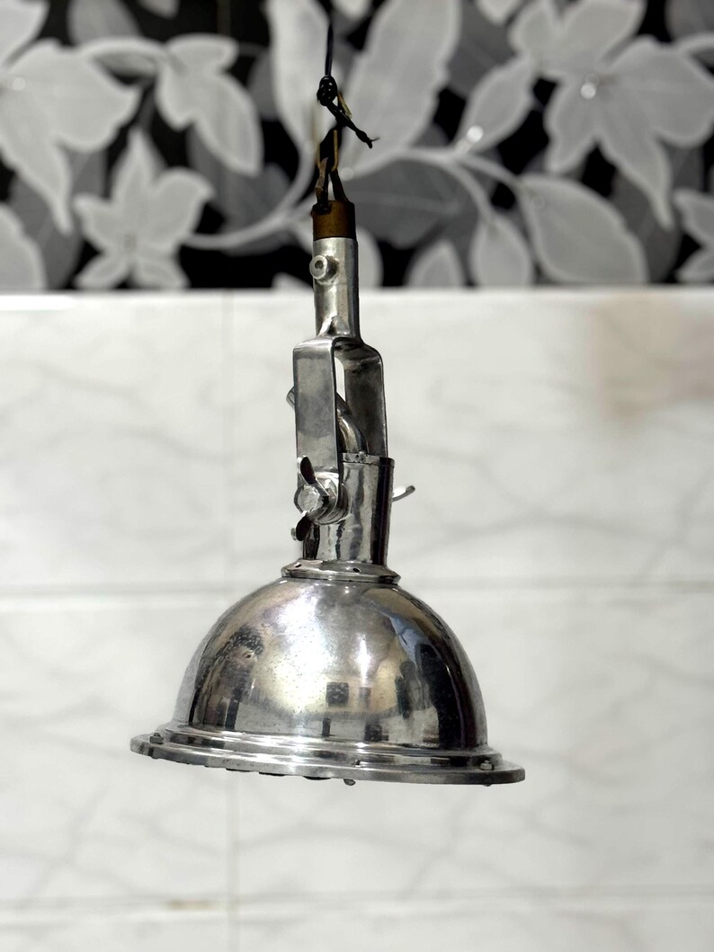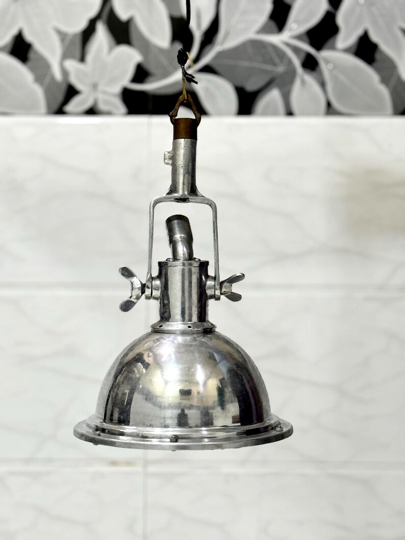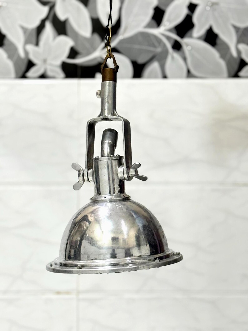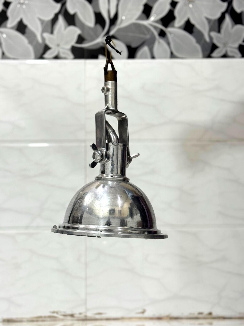 The polished aluminium dome reflects light efficiently while maintaining a raw, industrial aesthetic. The robust hanging mechanism and adjustable hardware give this fixture an authentic vintage character, making it both functional and decorative.