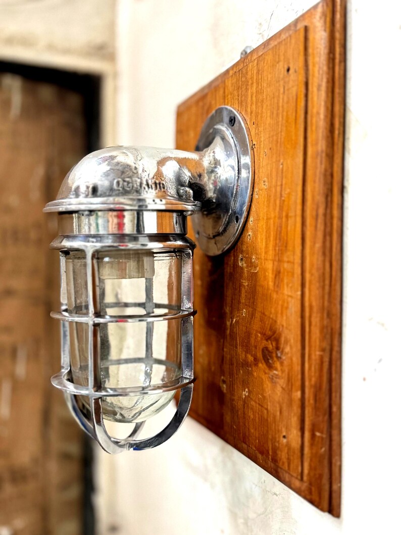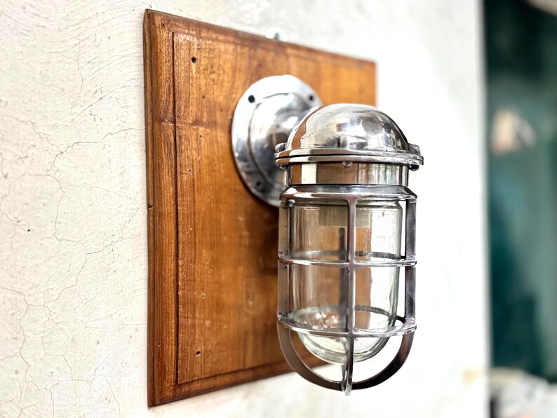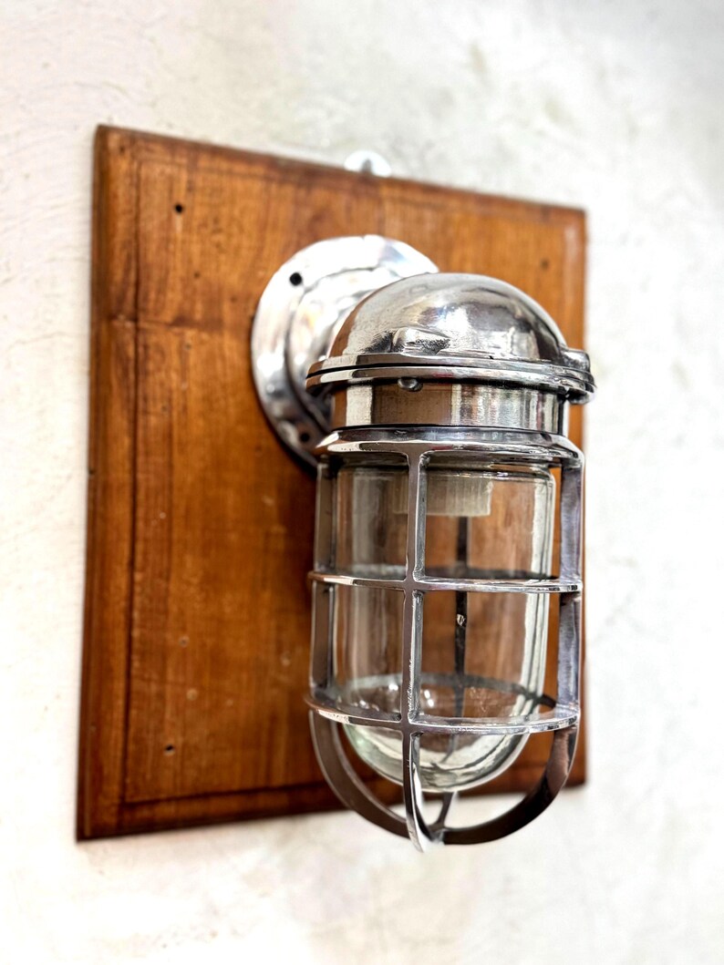 Add authentic maritime character to your space with this Vintage Aluminum Oceanic Bulkhead Wall Sconce. Inspired by classic ship and submarine lighting, this fixture features a solid aluminum body, thick clear glass, and a protective metal cage—designed to withstand demanding marine environments.