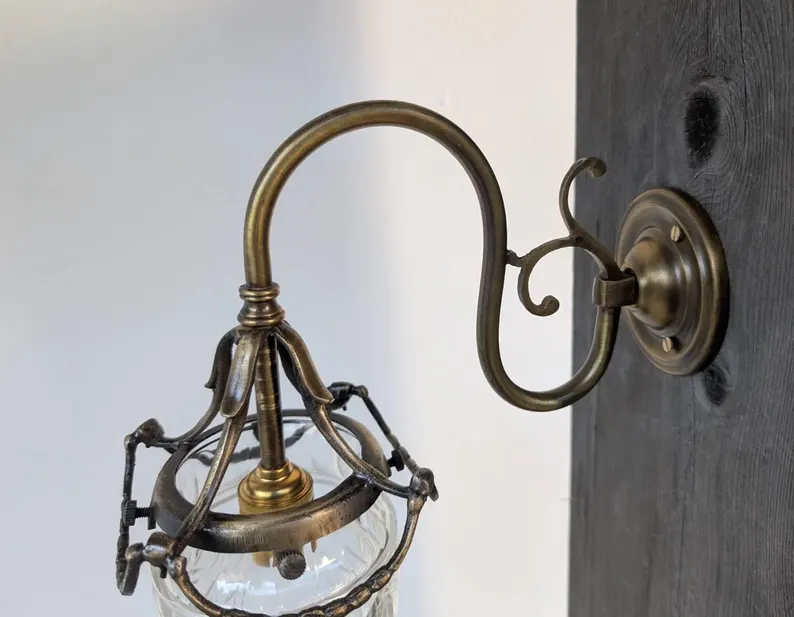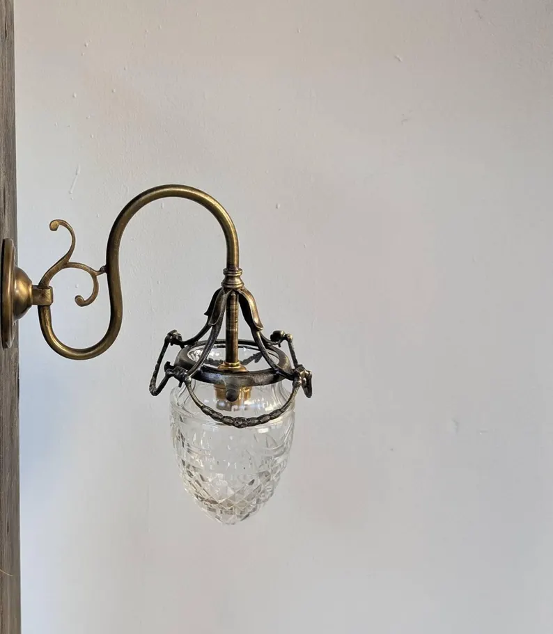 Bring timeless French elegance into your home with this beautifully crafted Vintage Brass Wall-Mounted Light. Designed with an ornate curved brass arm and a finely cut crystal-style glass shade, this fixture casts a soft, refracted glow that instantly elevates any interior.
