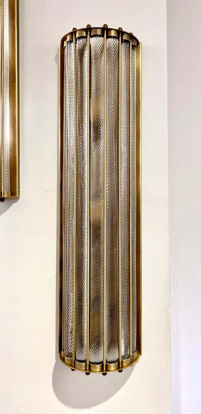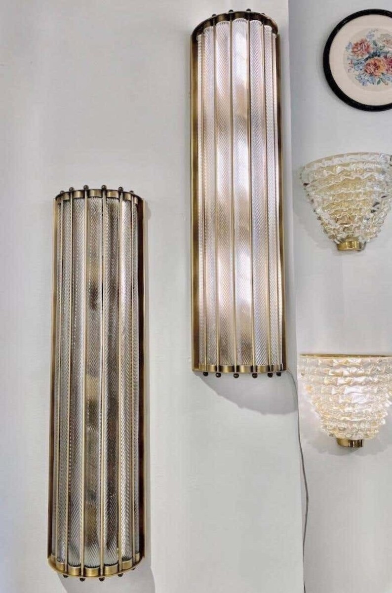Standing an impressive 28 inches in length, each sconce becomes a bold statement piece—ideal for hallways, living rooms, staircases, hotels, restaurants, galleries, and luxury interiors. The ribbed glass rods produce beautifully diffused light, capturing the iconic Art Deco aesthetic with a maritime twist.