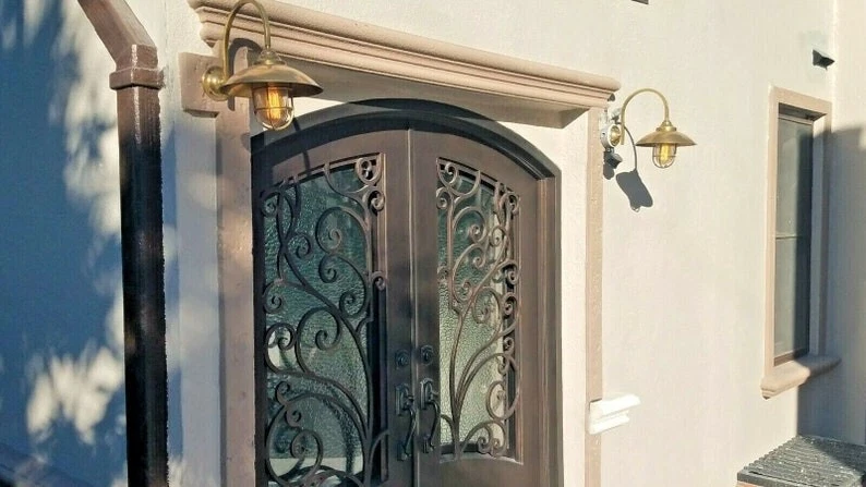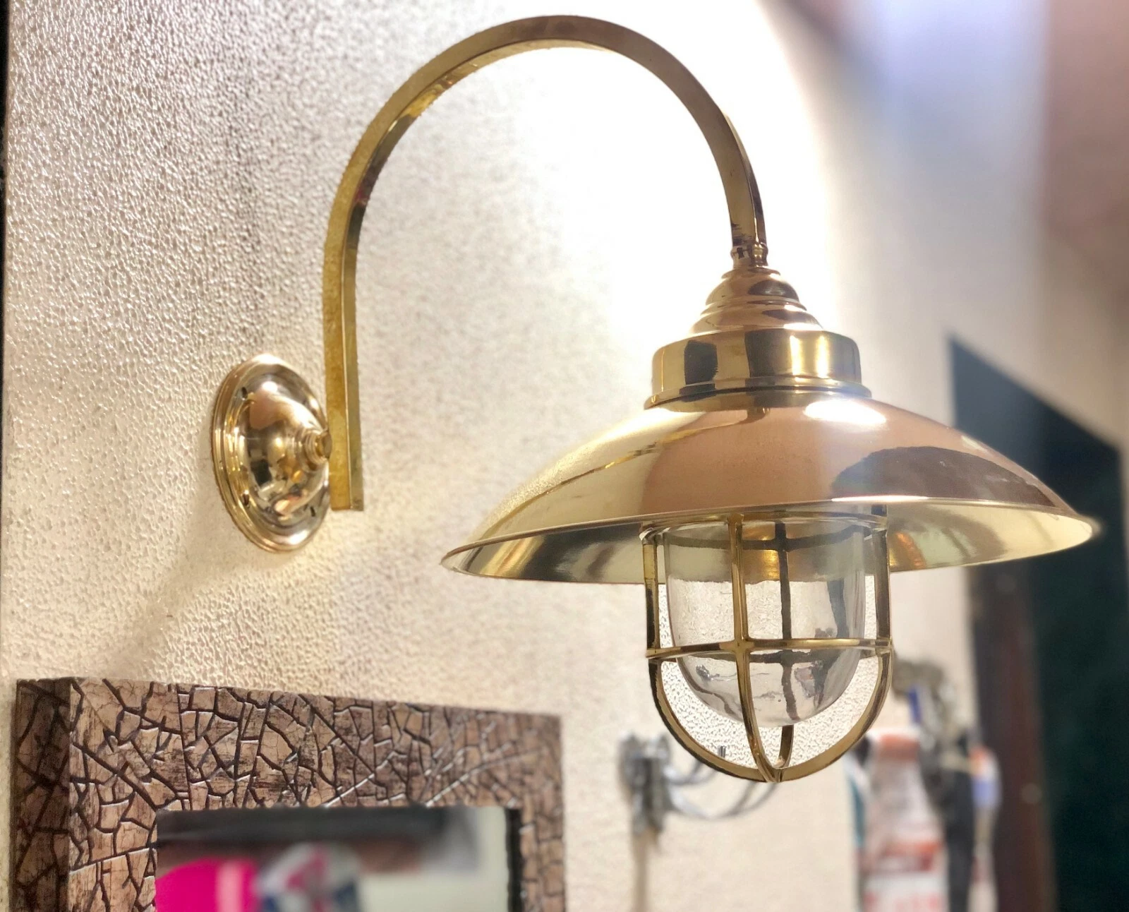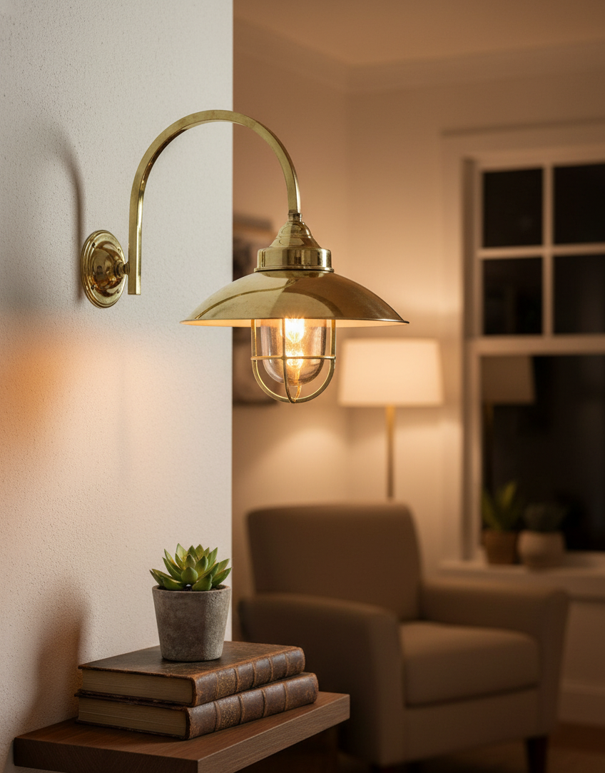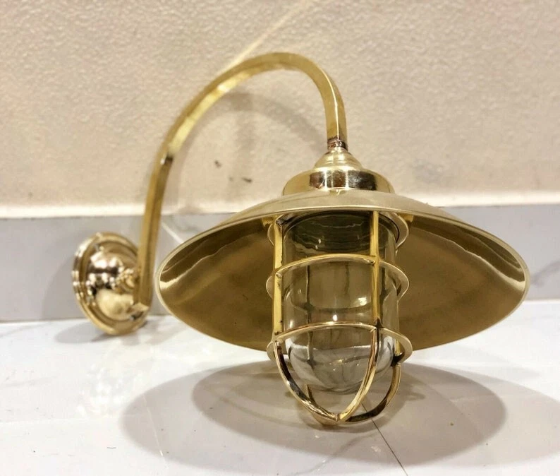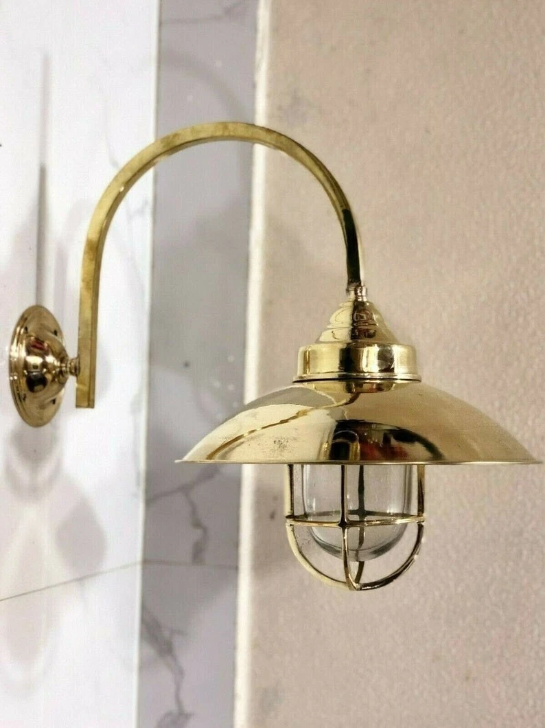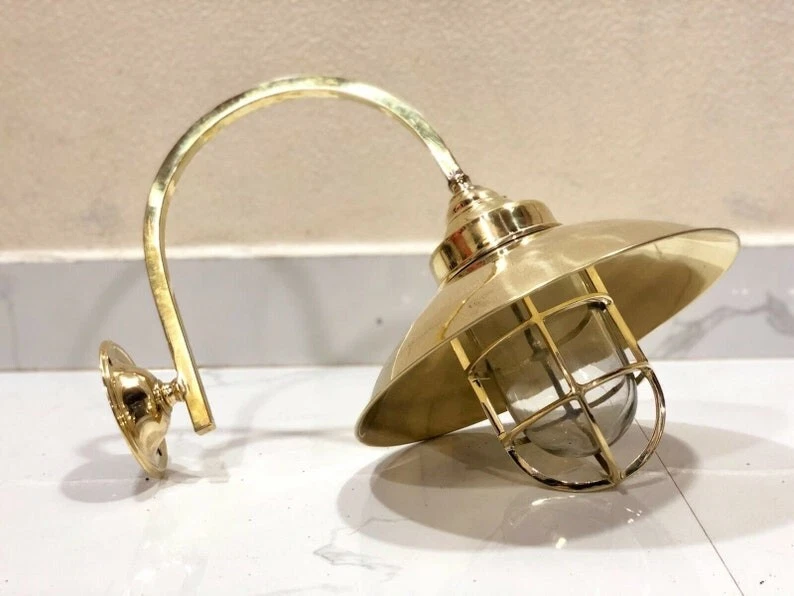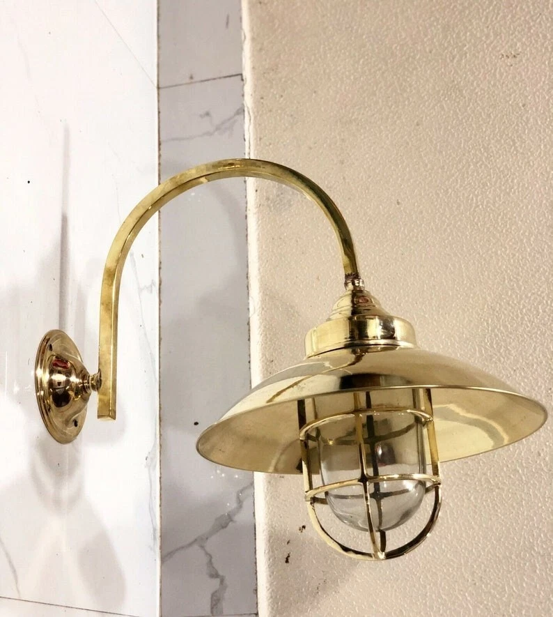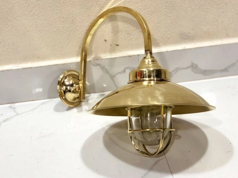 This classic nautical wall light features a curved gooseneck arm with a protective glass cage shade, inspired by original marine fixtures used on ships and coastal docks. Its vintage design and polished brass finish bring timeless beauty and functionality to coastal homes, restaurants, patios, and gardens.