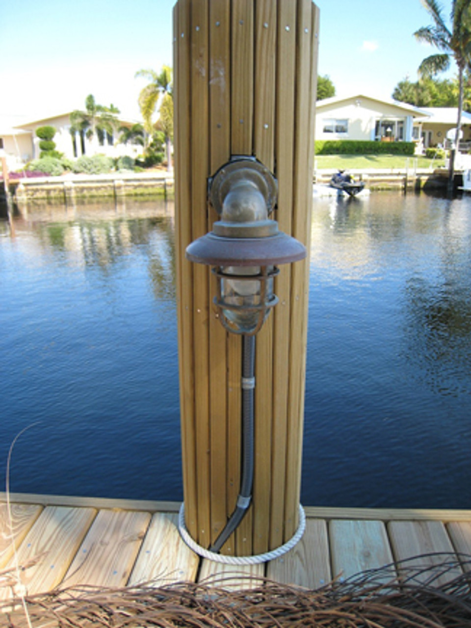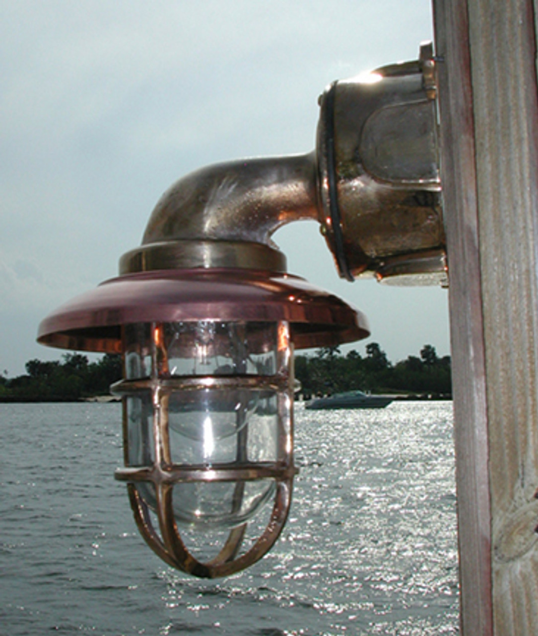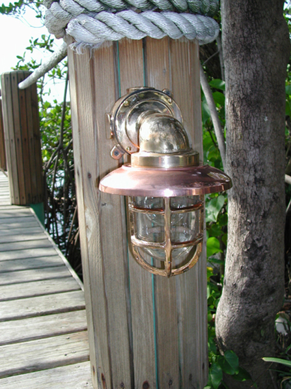 Made from solid brass with a polished copper hood, this durable marine-style light features a clear glass globe encased in a protective brass cage, ensuring both style and functionality. The 90-degree swan neck design makes it ideal for dock posts, boathouses, pathways, and seaside patios.