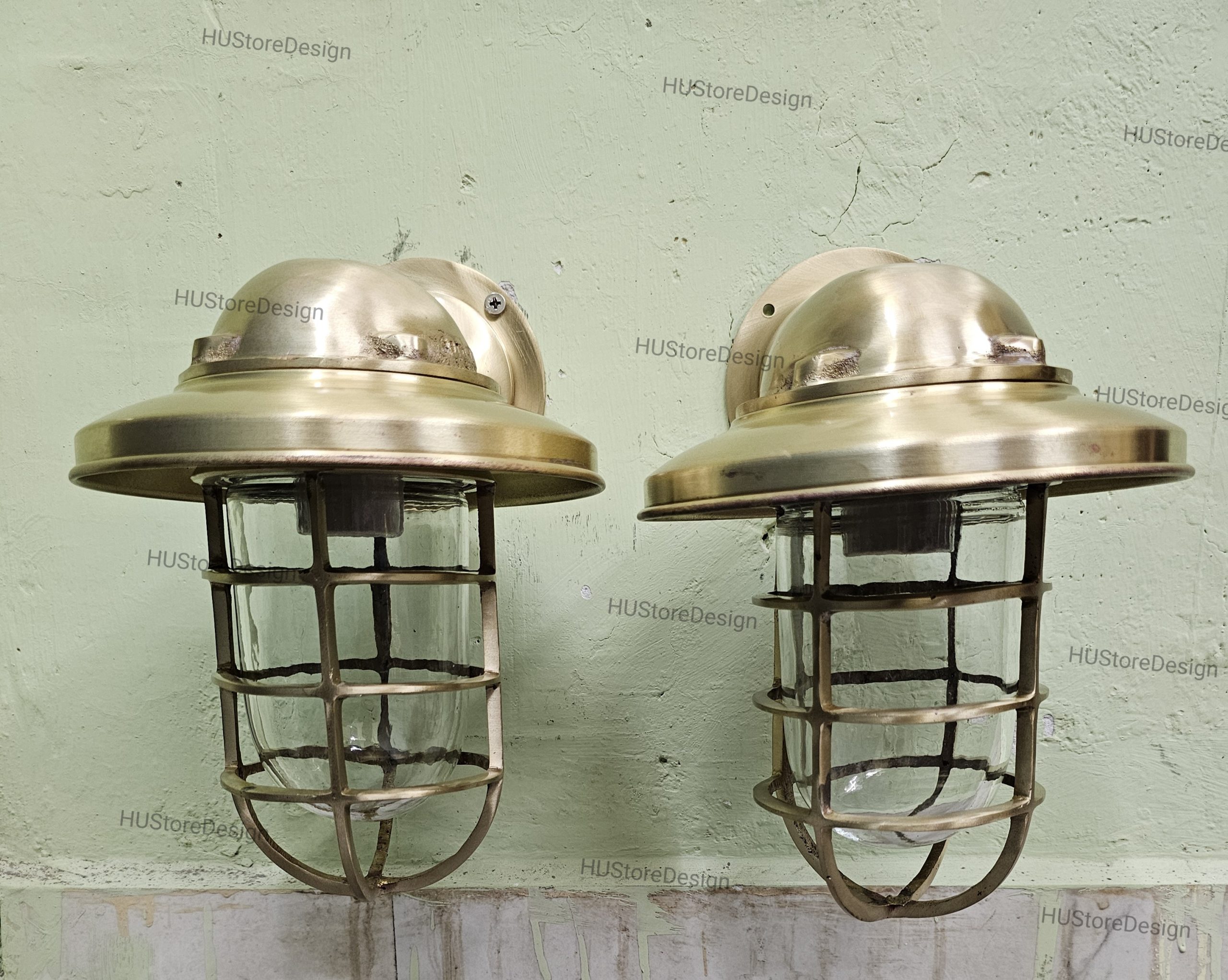 Each light is handcrafted from solid brass with a wide shade and a protective caged glass dome, inspired by original marine bulkhead fixtures used aboard ships and seaside docks.