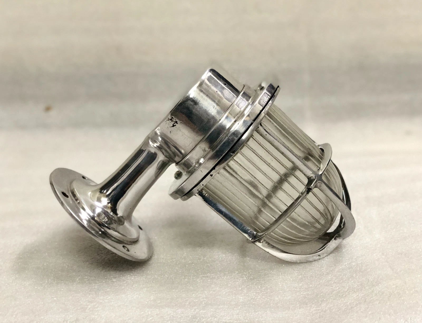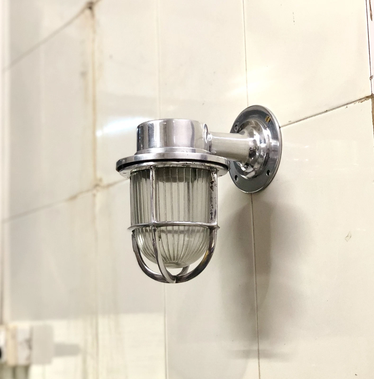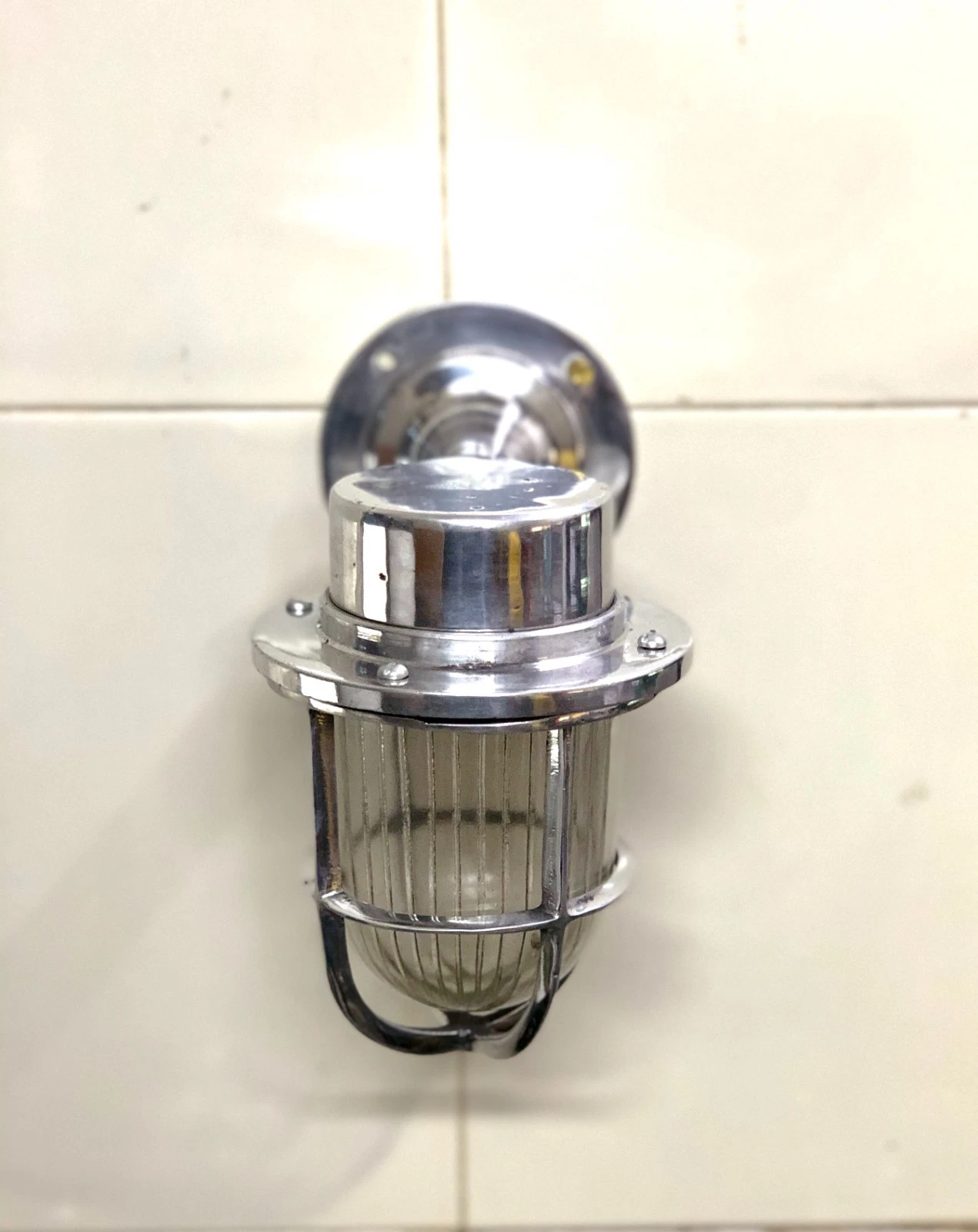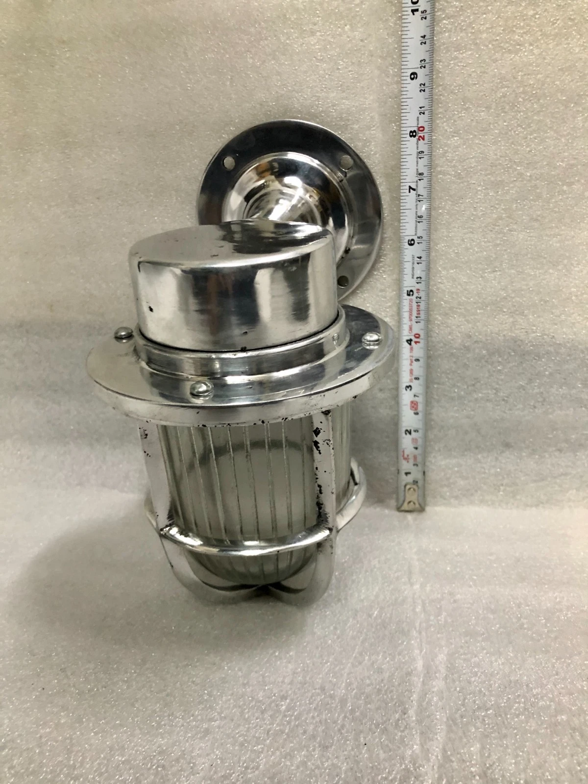 Bring authentic nautical charm into your home with this vintage-style aluminum wall-mounted cage light. Designed after classic marine bulkhead fixtures, it features a solid aluminum body and a ribbed glass globe secured with a protective cage.