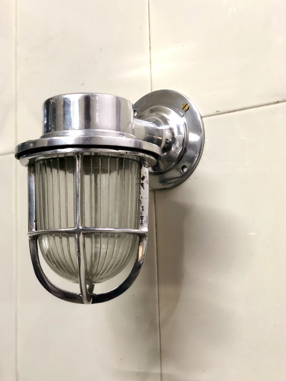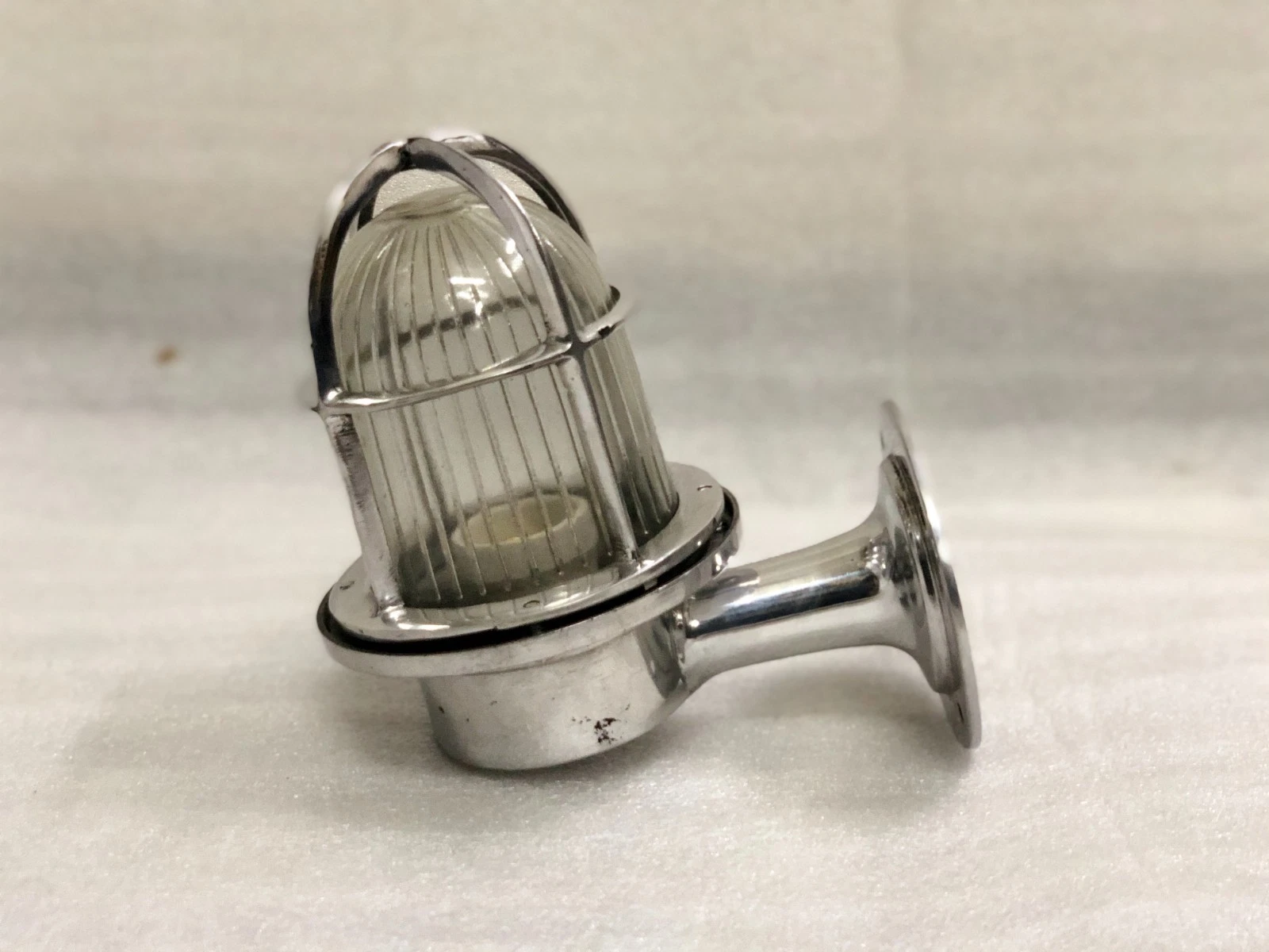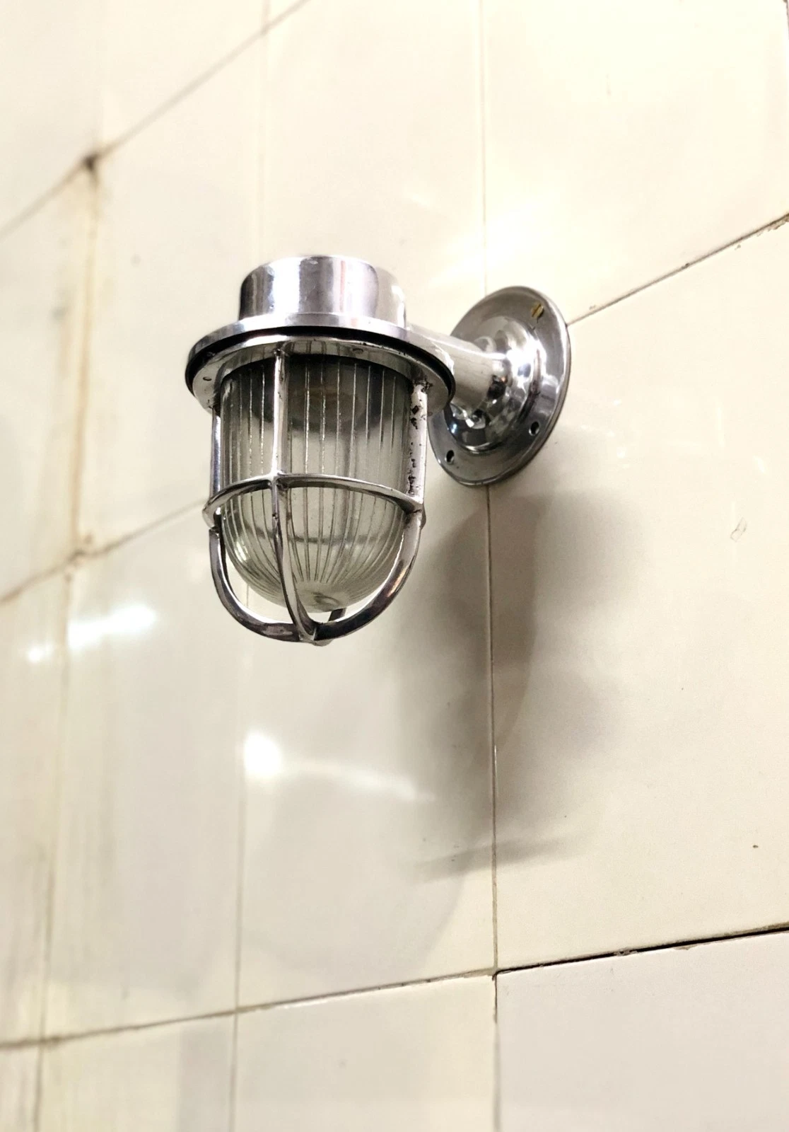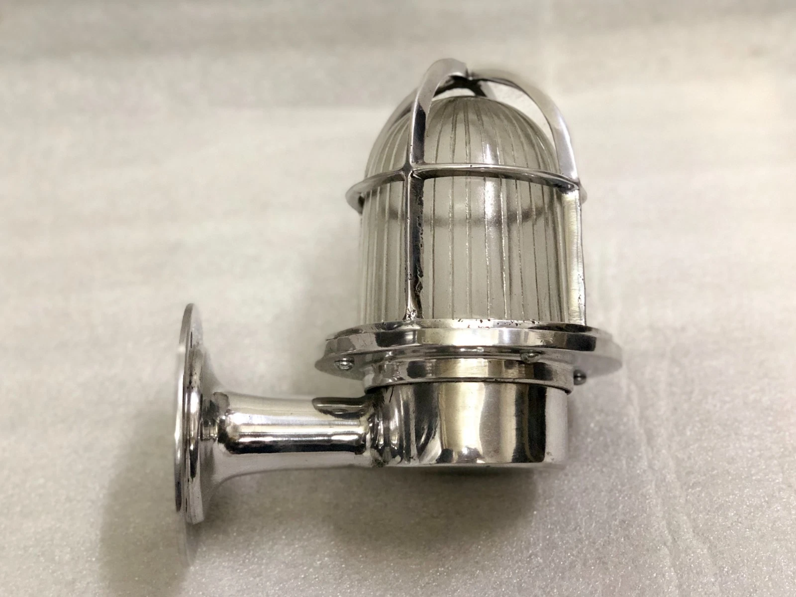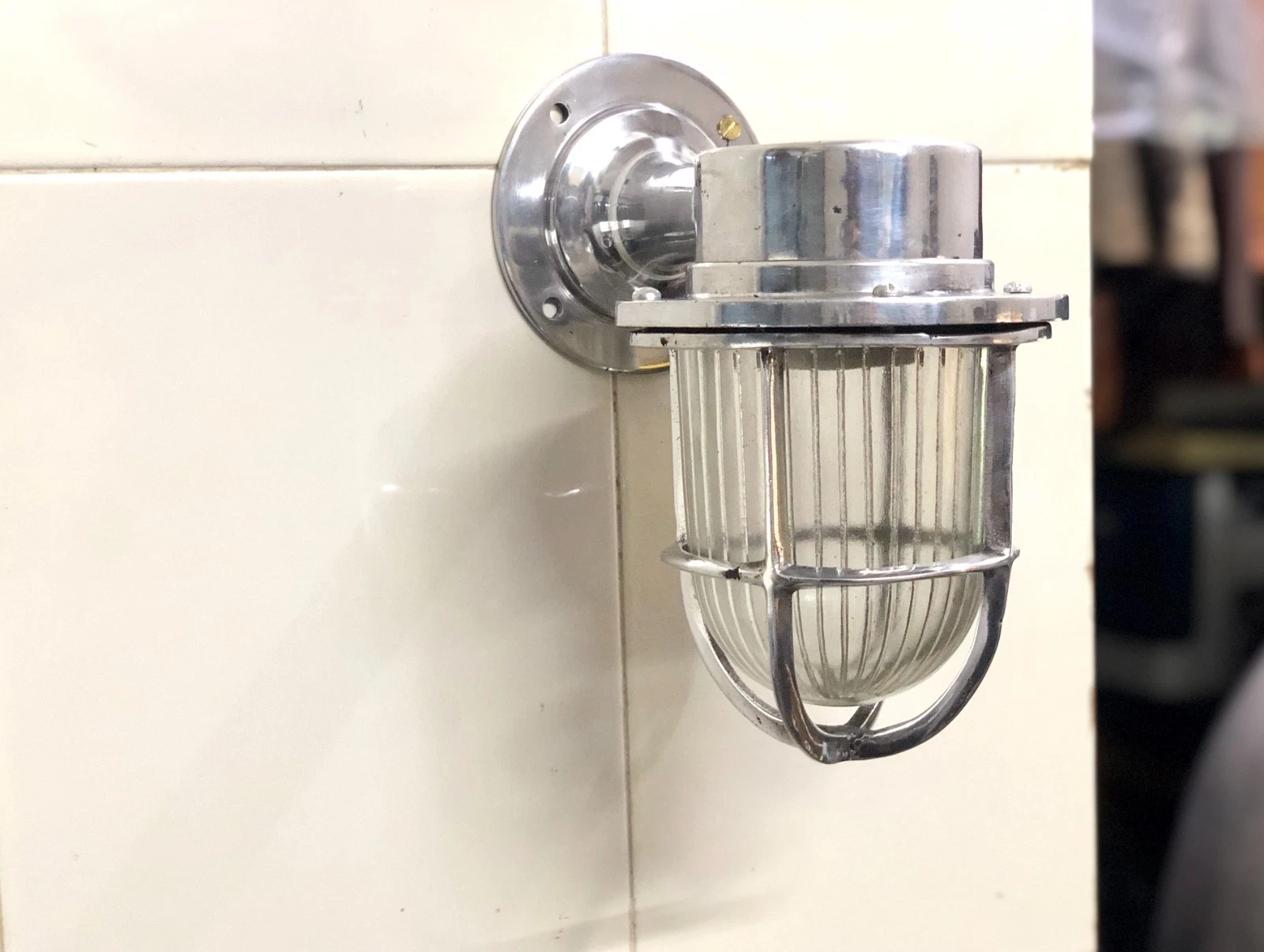Bring authentic nautical charm into your home with this vintage-style aluminum wall-mounted cage light. Designed after classic marine bulkhead fixtures, it features a solid aluminum body and a ribbed glass globe secured with a protective cage.