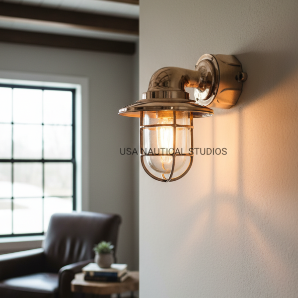Bring timeless maritime style into your home with the Oceanic Brass Bulkhead Sconce. Crafted from solid polished brass with a protective cage and clear glass dome shade, this fixture is built to last while adding vintage nautical charm. Inspired by authentic ship lighting, it is ideal for hallways, bathrooms, patios, porches, and coastal-themed interiors. Both decorative and functional, this sconce delivers a warm glow and rugged marine durability that stands the test of time.