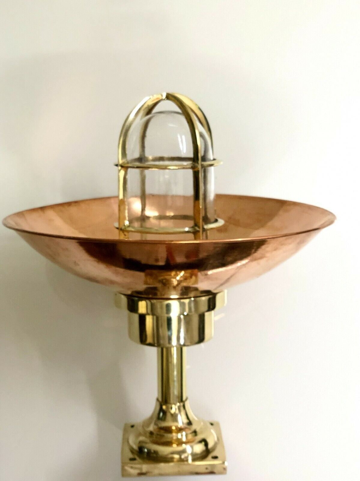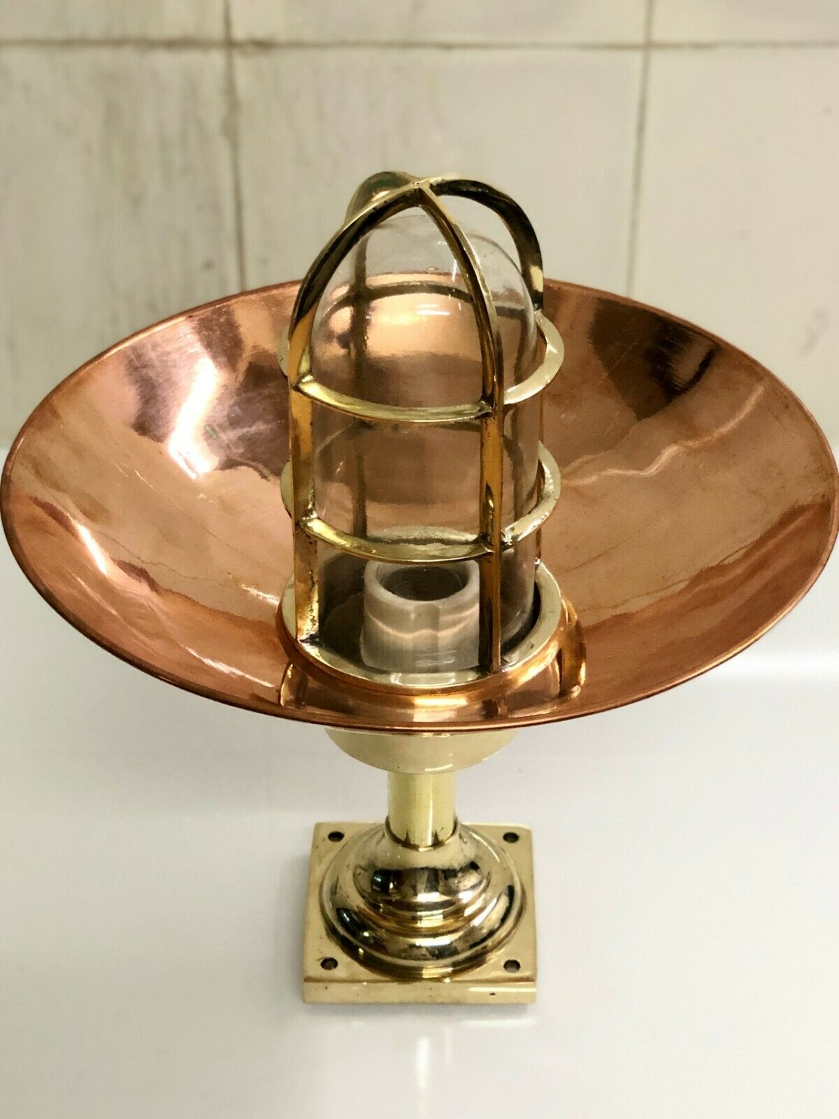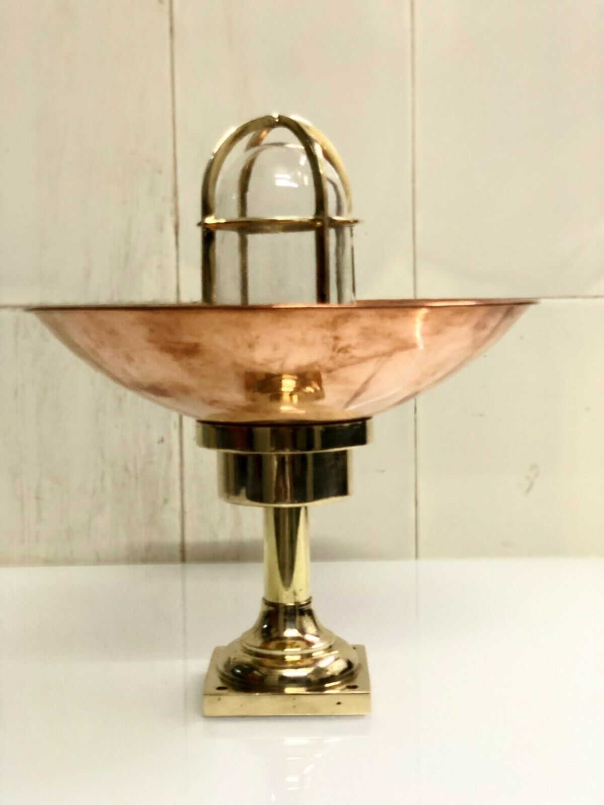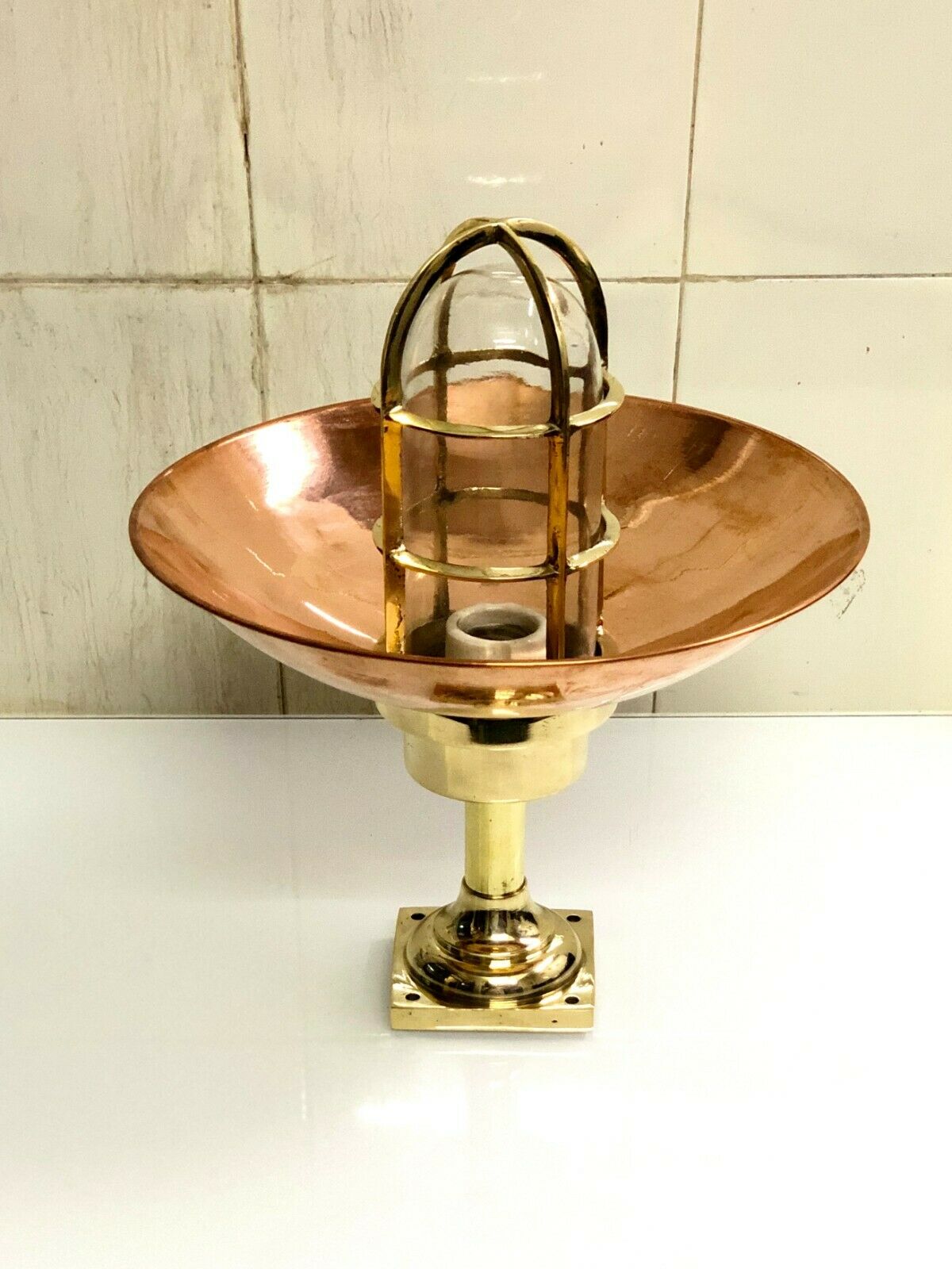 Beautifully handcrafted from solid brass with a polished copper shade and a cage-protected glass dome, this lamp brings a perfect balance of nautical authenticity and modern elegance.