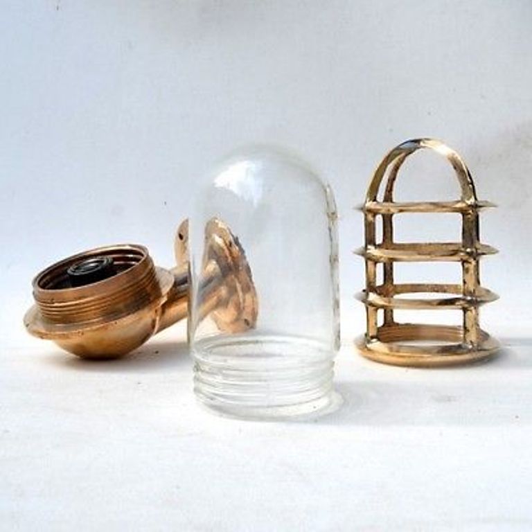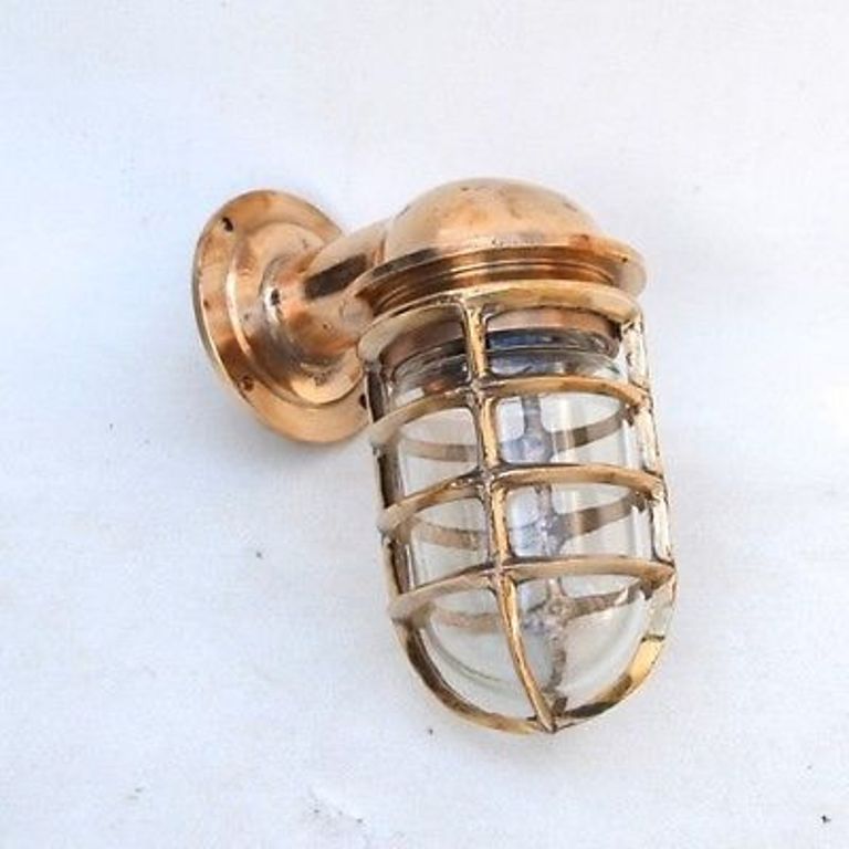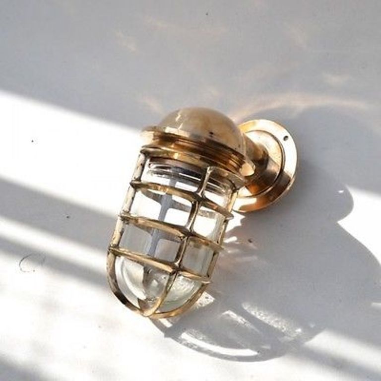 Add a touch of maritime authenticity to your space with this Vintage Brass Nautical Bulkhead Wall Light. Handcrafted from solid brass, this wall-mounted fixture features a clear glass dome protected by a sturdy brass cage, inspired by classic ship and marine lighting.