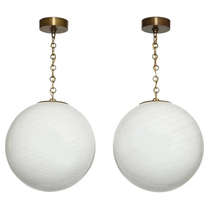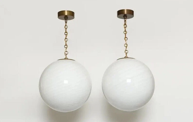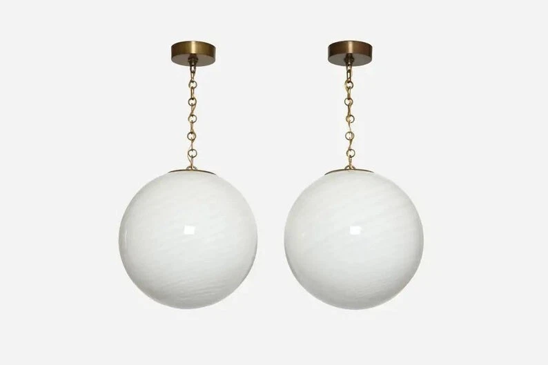 Each lamp features a 15-inch diameter milk glass globe suspended by a brass chain (30-inch total height) — ideal for dining rooms, kitchens, hallways, entryways, and high ceilings. Its minimalist round globe diffuses soft light evenly, adding a touch of sophistication and luxury to your space.