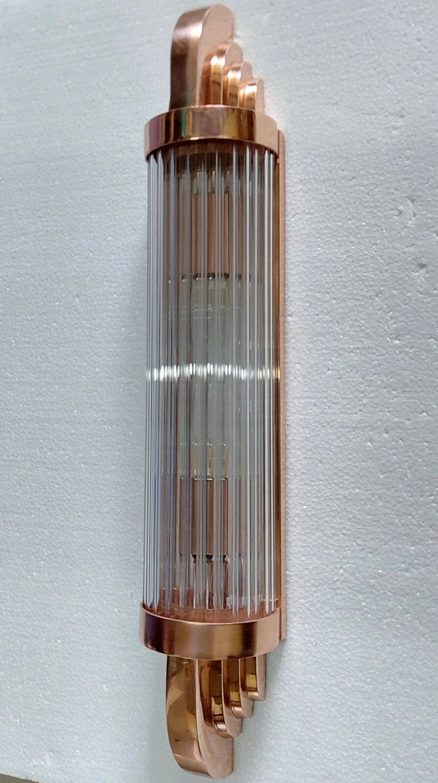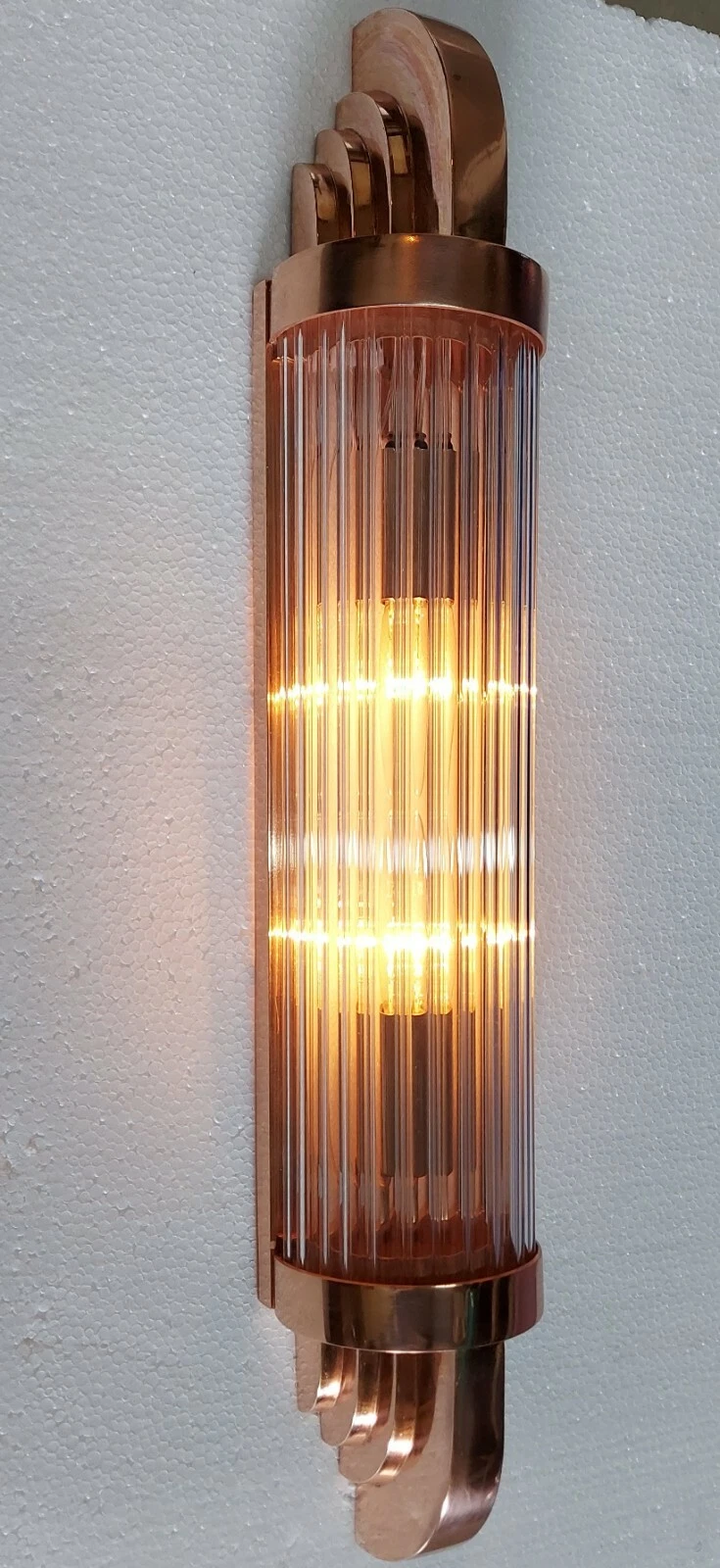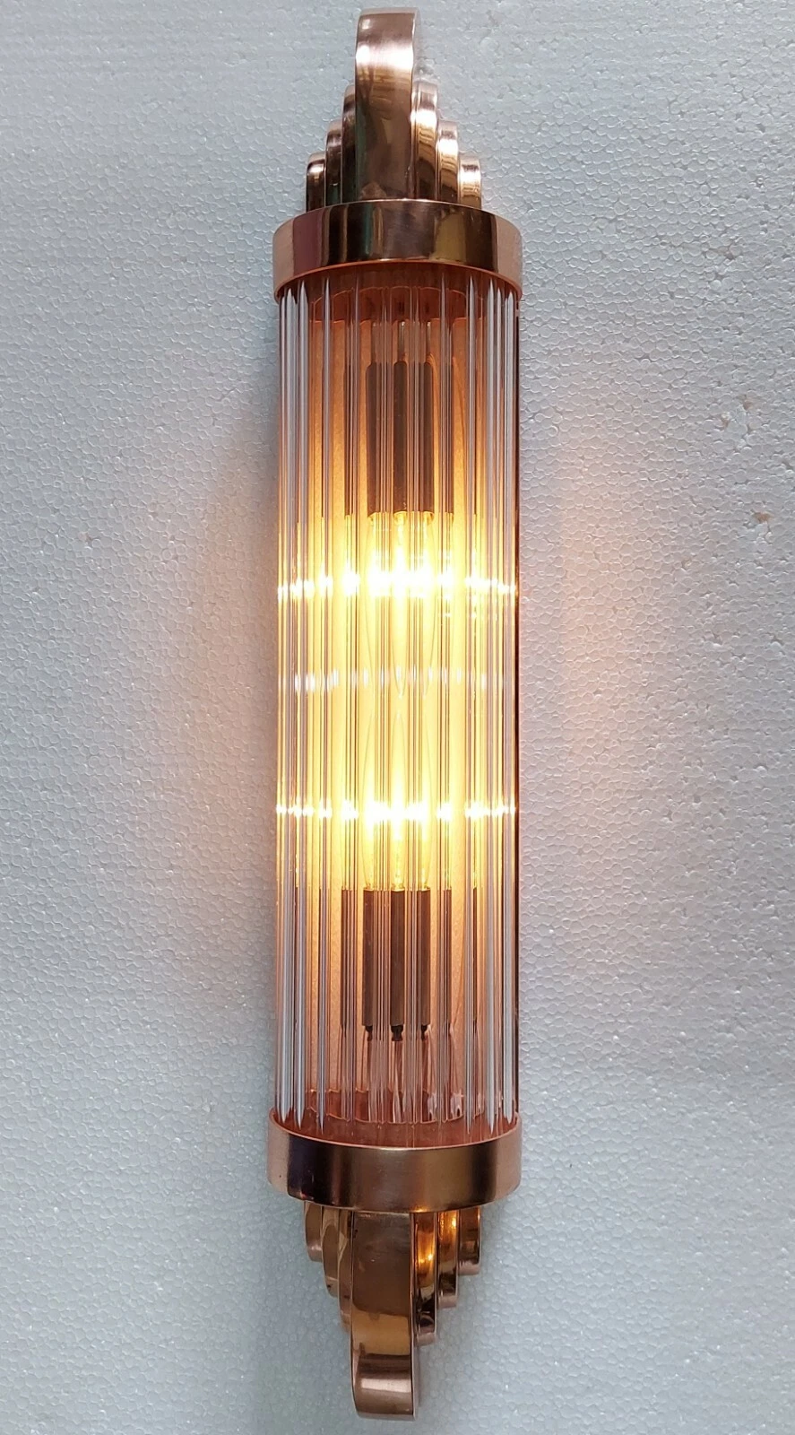 The sleek copper frame and vertical glass rods create a radiant glow that enhances any hallway, living room, hotel suite, or restaurant wall. Perfect for those who appreciate vintage design, architectural lighting, and classic craftsmanship.