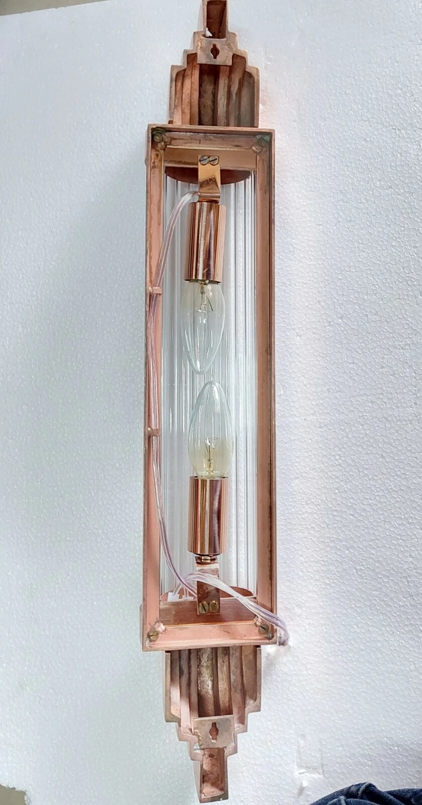 Illuminate your space with timeless elegance using this Antique Art Deco Skyscraper Wall Light — a rare blend of copper craftsmanship and ribbed glass rod detailing.