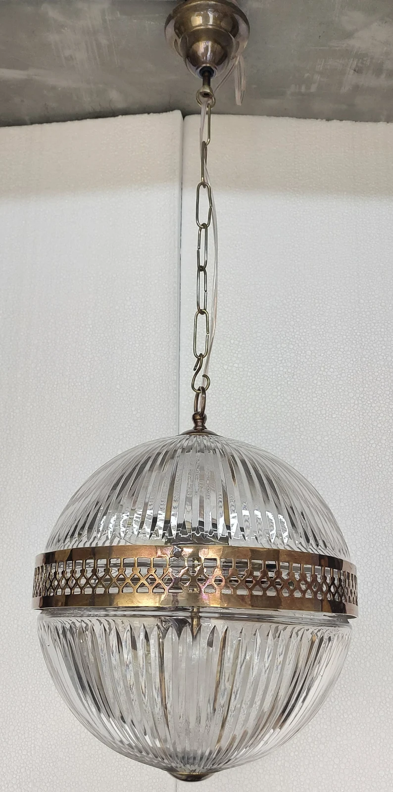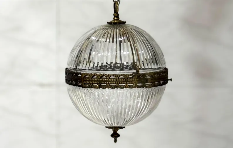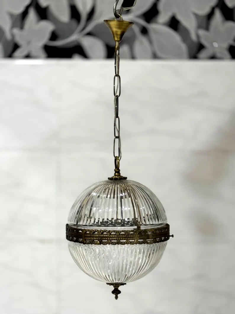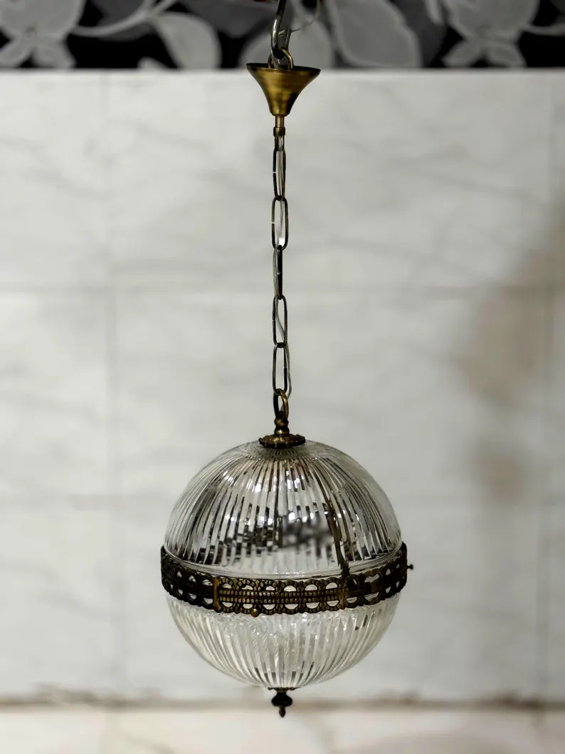 This Rare Vintage Art Deco Pendant Light is a stunning example of early 20th-century elegance and craftsmanship. Featuring a solid brass frame paired with beautifully cut crystal glass, this ceiling-hanging fixture captures the glamour and geometric sophistication that defined the Art Deco era.