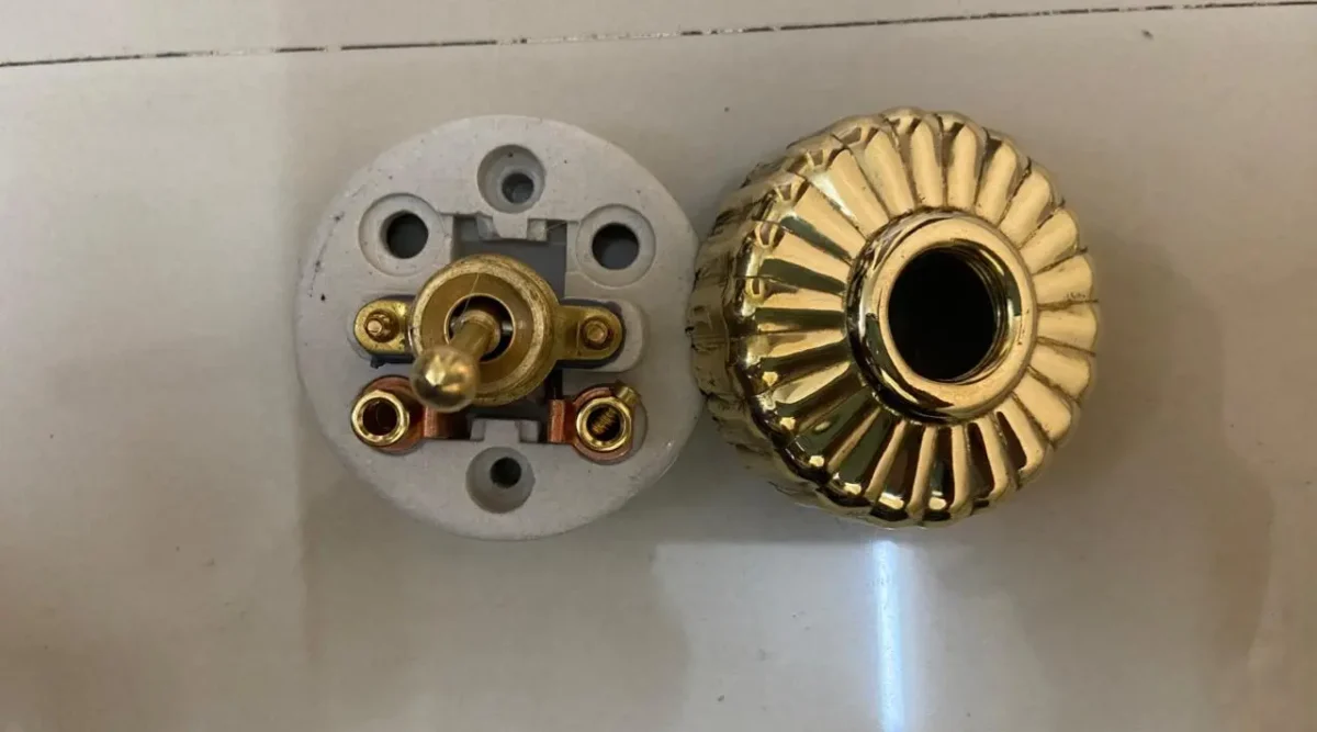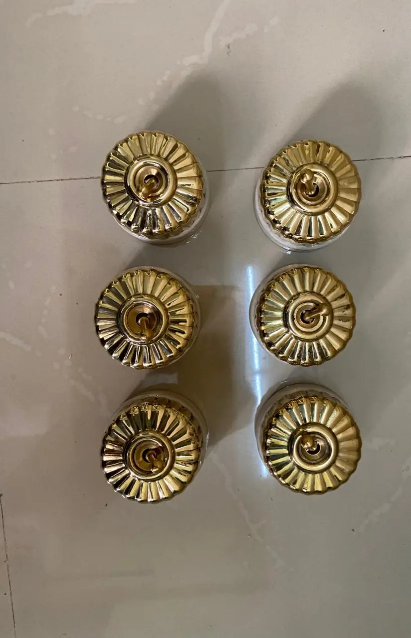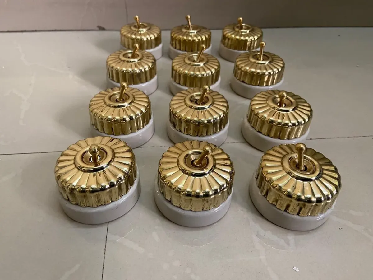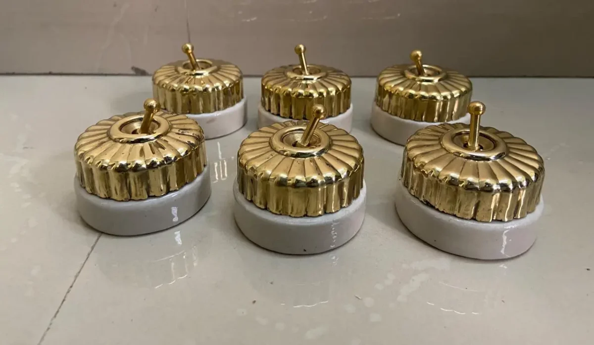 Step back in time with this exquisite collection of 1920s vintage vitreous brass and ceramic electric switches. These beautifully crafted pieces showcase timeless design and exceptional craftsmanship, blending polished brass with durable ceramic. Perfect for antique enthusiasts and those seeking to add a touch of vintage elegance to their home decor. These switches are not only functional but also serve as striking decorative elements, ideal for restoring period interiors or adding retro charm to modern spaces. A must-have for collectors and lovers of classic design
