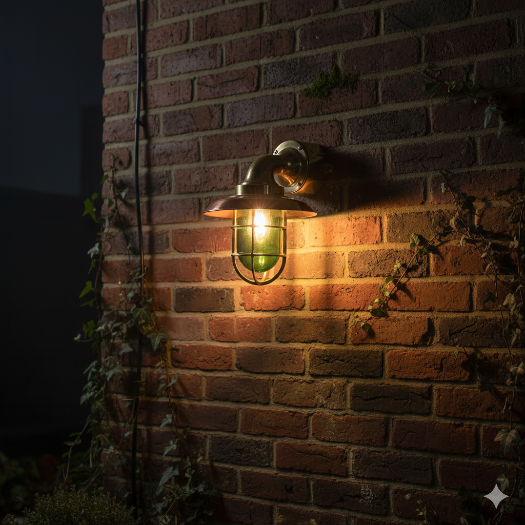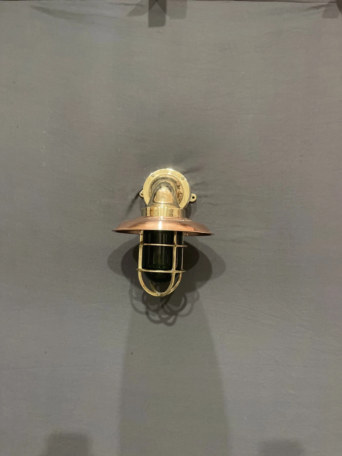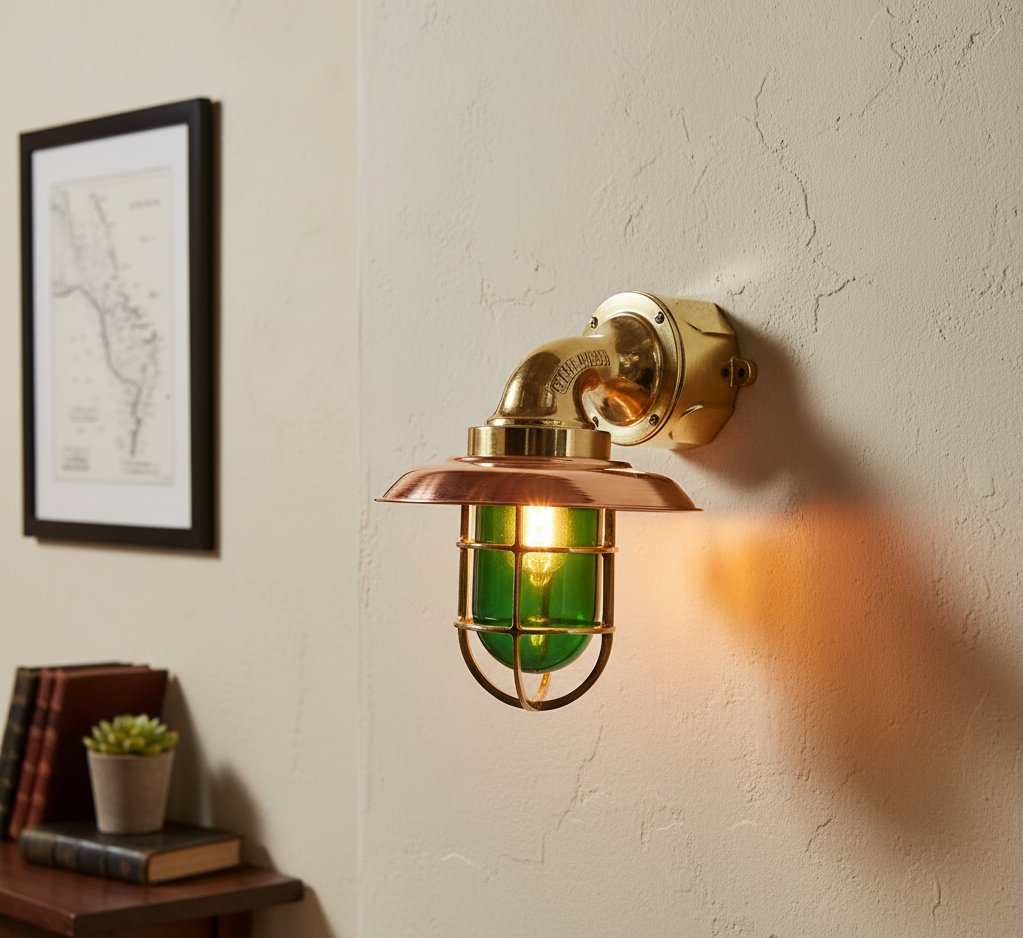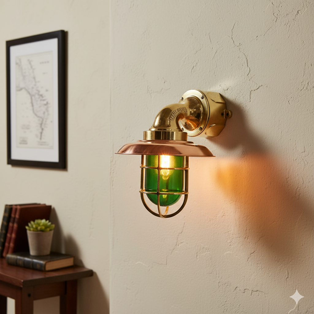 Bring authentic maritime charm to your interiors with this handcrafted brass and copper nautical wall sconce featuring a rare green glass cage light. Inspired by real ship bulkhead lighting, this fixture combines durability with timeless style.