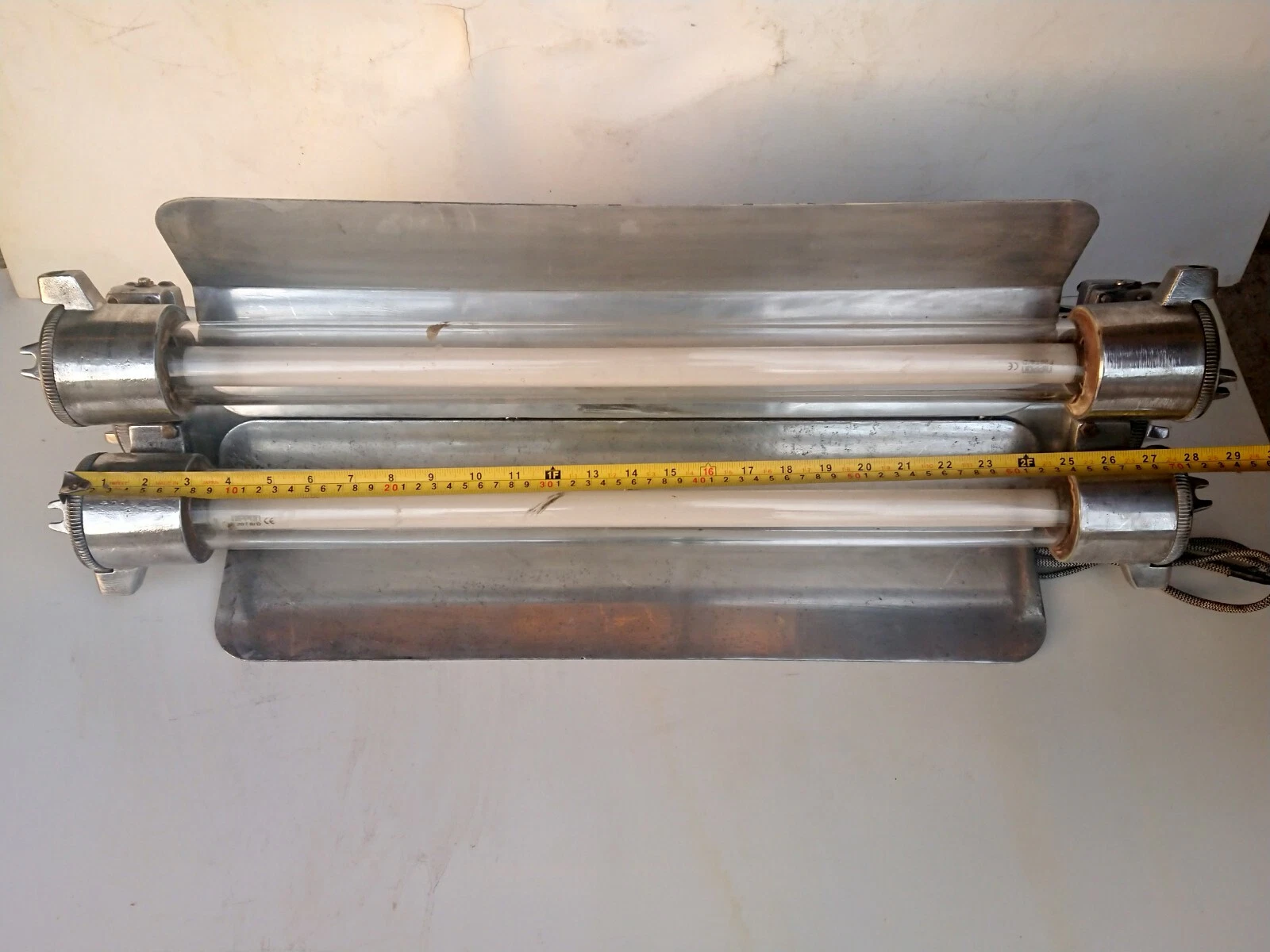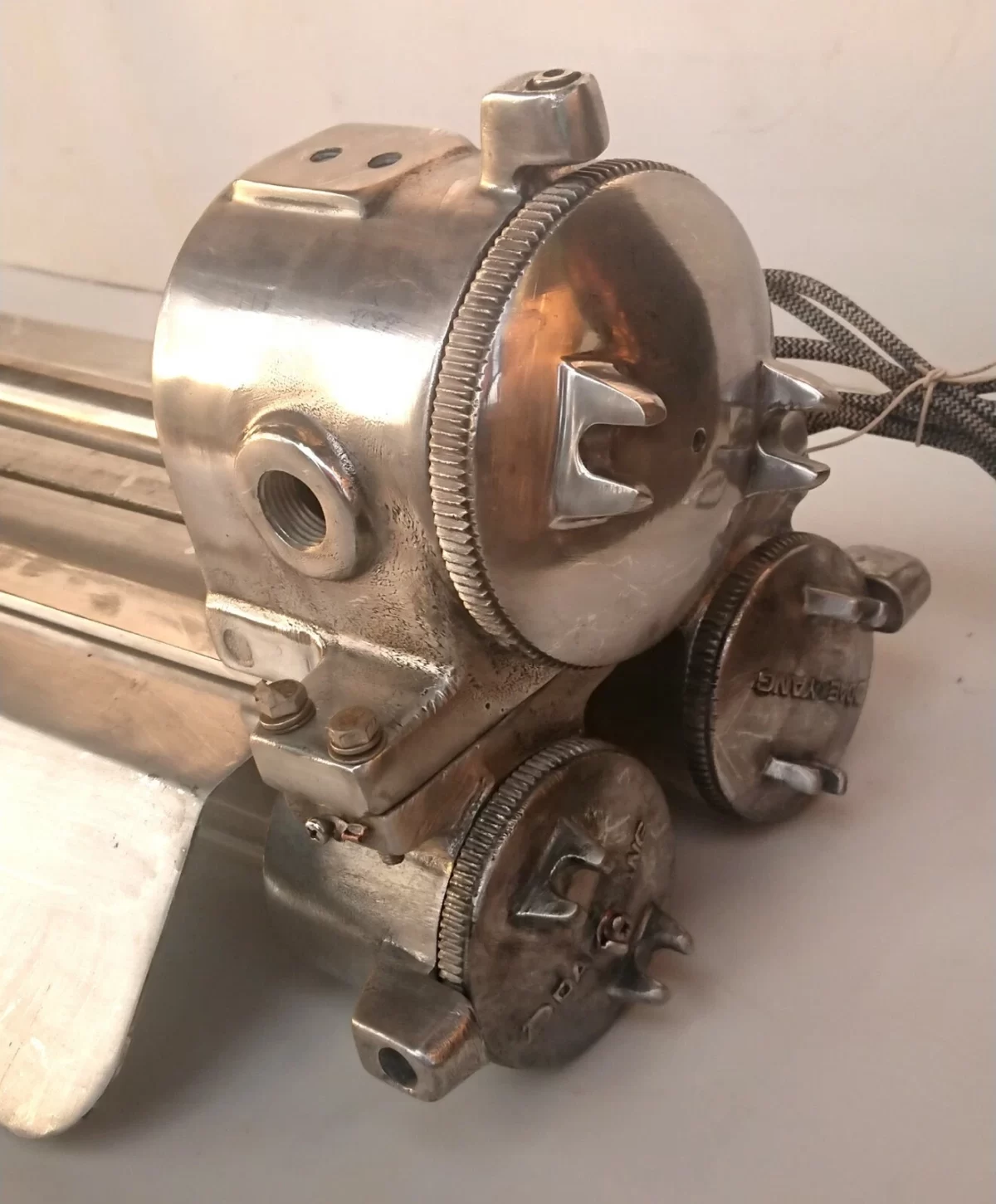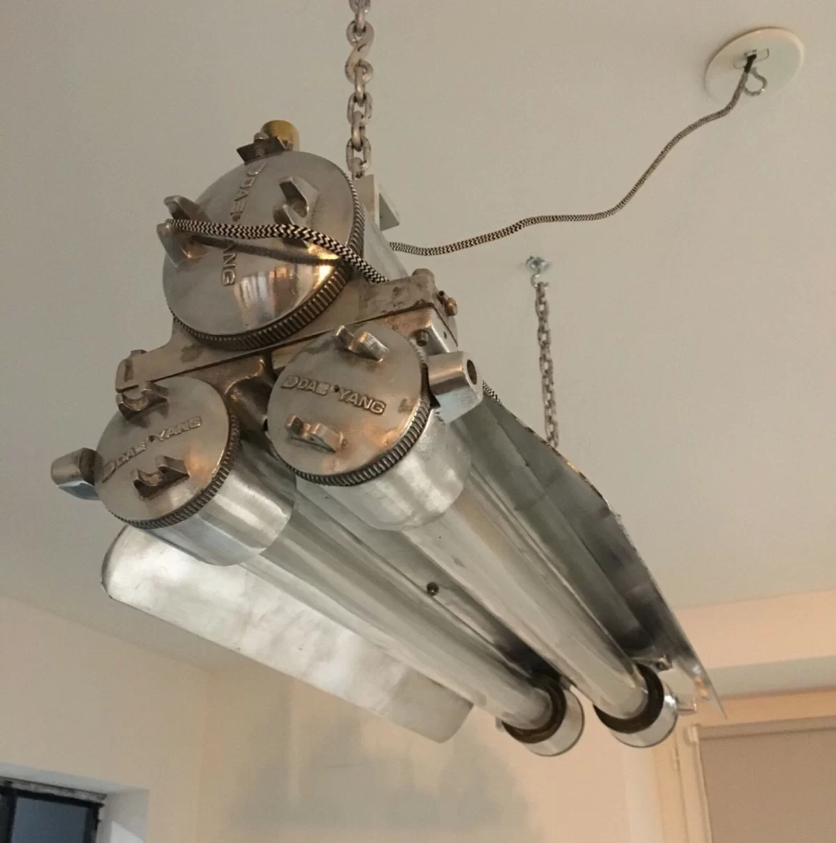 This vintage flameproof strip light was manufactured by Daeyang, Korea in 1978, originally designed to illuminate hazardous zones aboard supertankers, cargo ships, and military vessels. Built for extreme durability, the fixture features a cast aluminum body, steel and brass fittings, and cylindrical glass lamp housings.