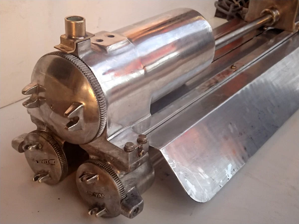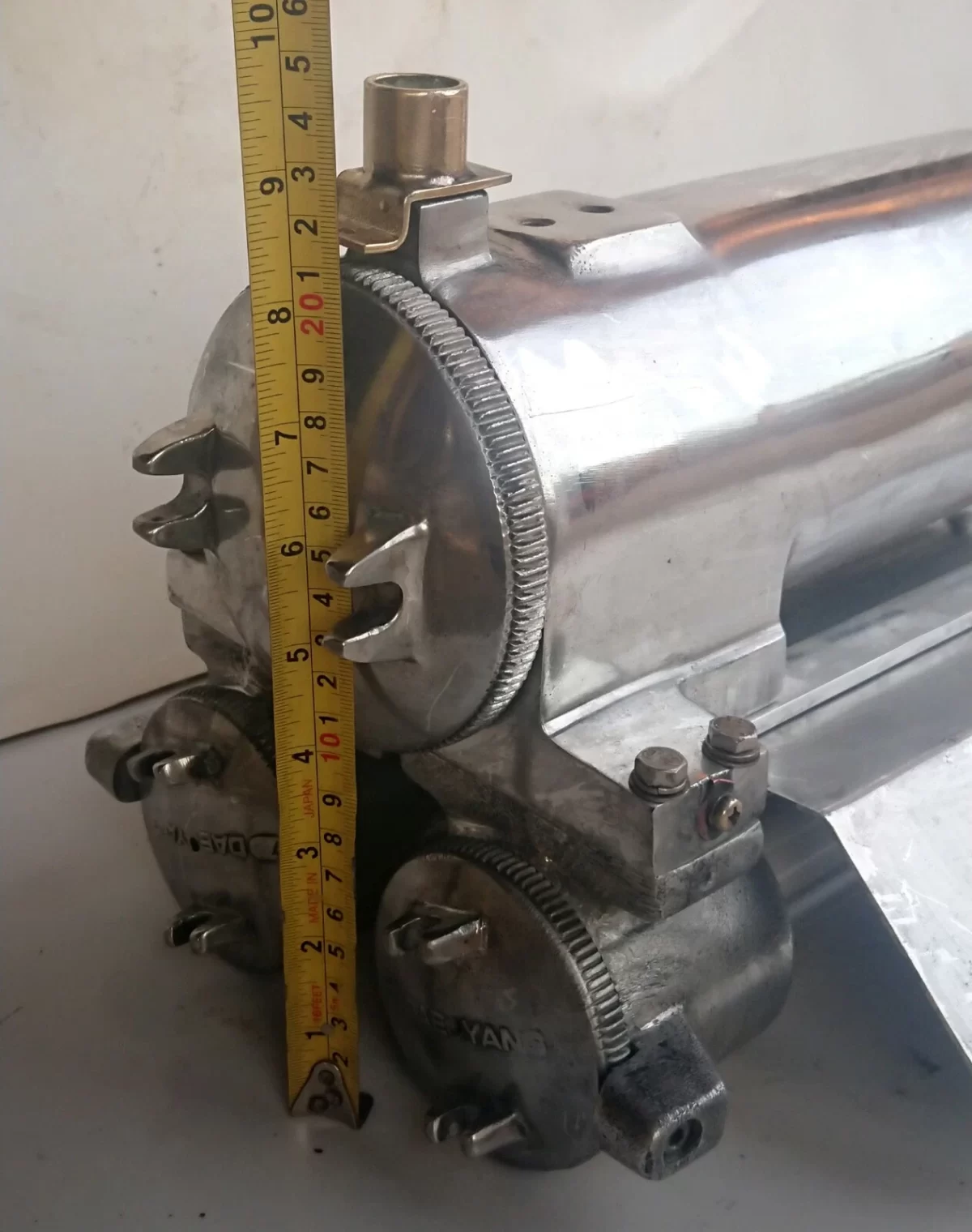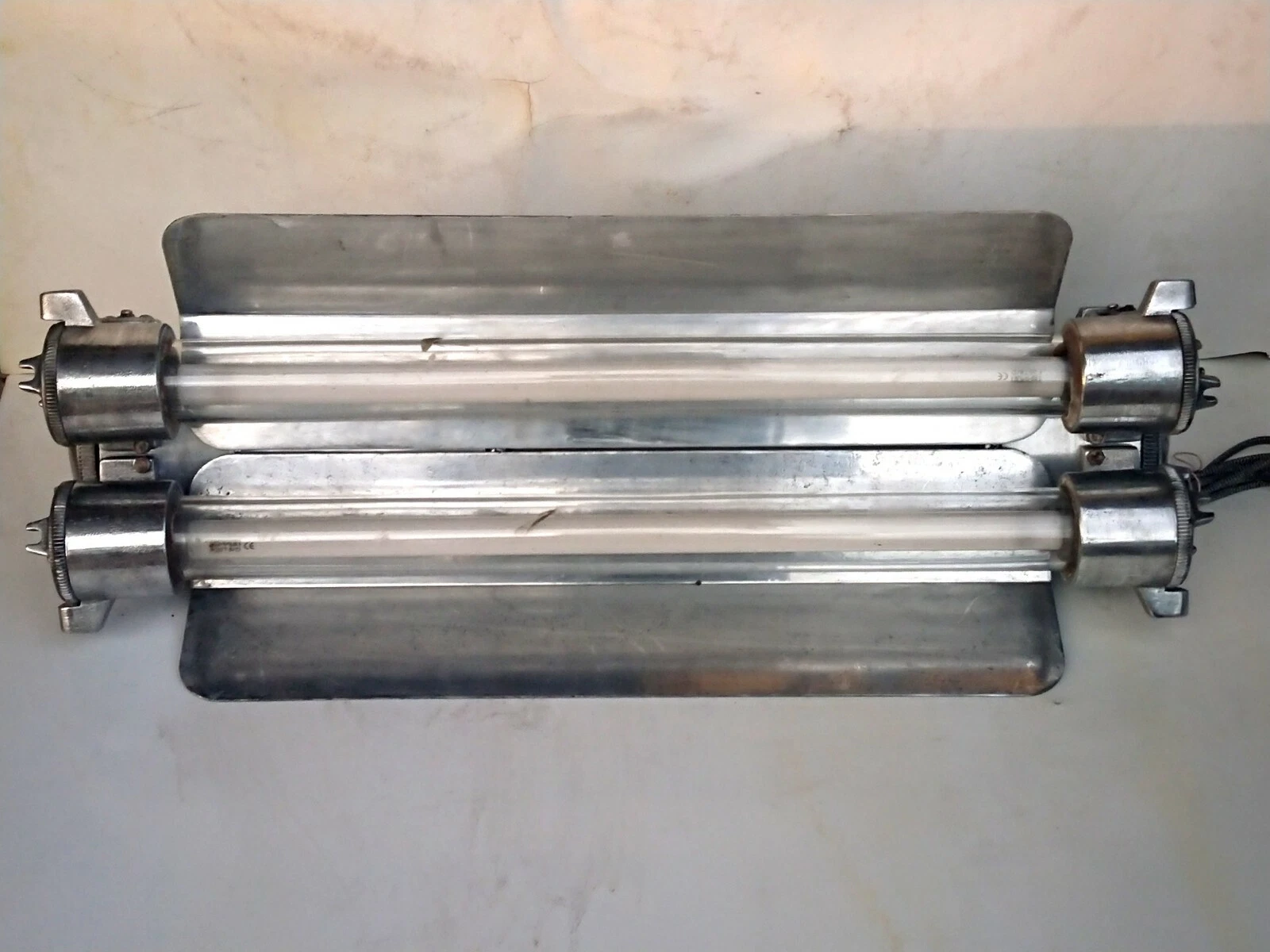 This vintage flameproof strip light was manufactured by Daeyang, Korea in 1978, originally designed to illuminate hazardous zones aboard supertankers, cargo ships, and military vessels. Built for extreme durability, the fixture features a cast aluminum body, steel and brass fittings, and cylindrical glass lamp housings.