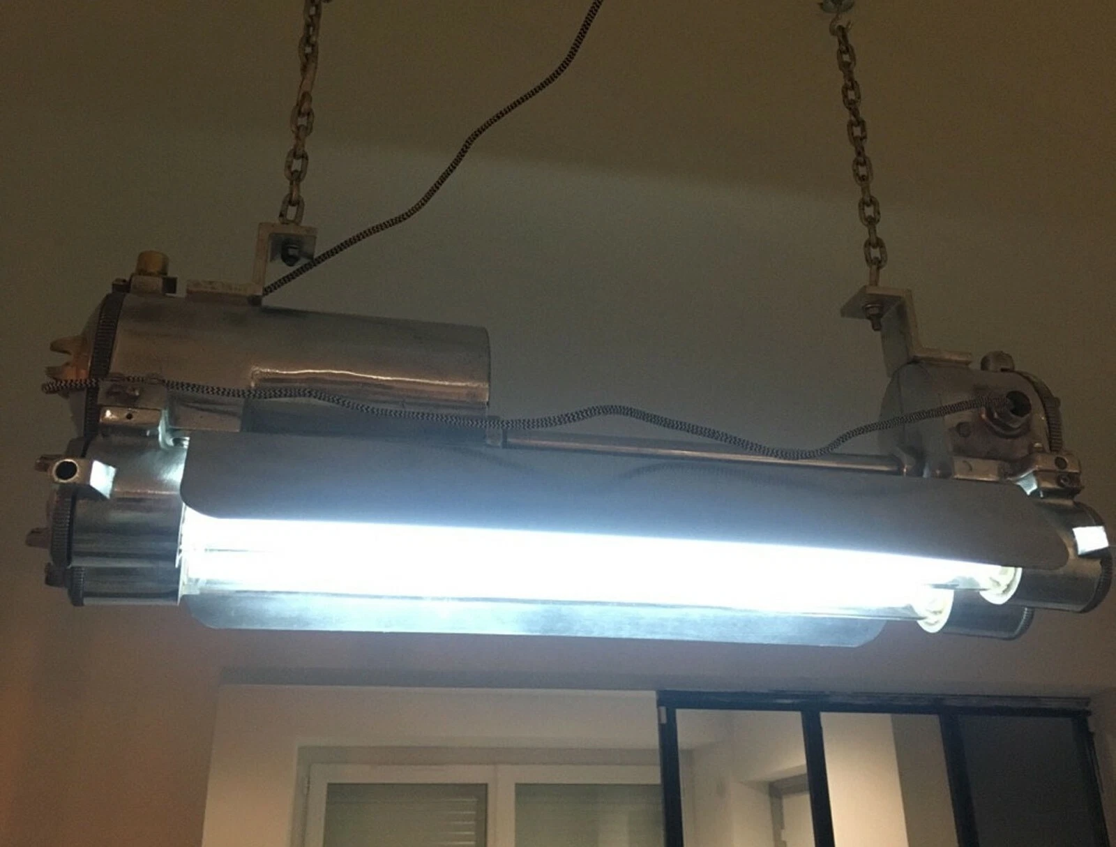 Fully restored and polished, it has been re-wired by Loomlight with CE-approved components and fitted with 2x warm white (2700K–3000K) LED T8 tubes, compatible with 100V–240V electrics. Explosion-proof rated IP55, this industrial pendant lamp is safe for wet zones such as kitchens and bathrooms, while serving as a striking statement piece in homes, bars, restaurants, and loft interiors.